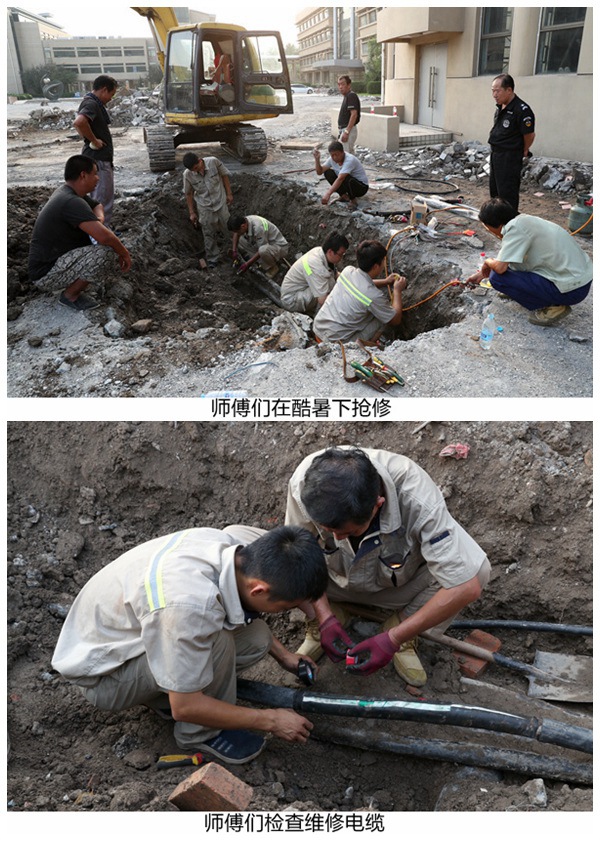 据了解,当日闷热的天气给抢修工作造成难度,现场38摄氏度的高温,使抢修人员脸上、额头布满汗水,衣服也跟刚浸过水一样紧紧贴在身上。因电缆线路埋藏于地下,他们动用铲车等大型设备将电缆刨出以更换损坏部位线路。抢修人员杨康边擦拭额头上的汗边说:“发生电力故障,我们首要任务就是第一时间把电修好,力争将损失降到最低”。