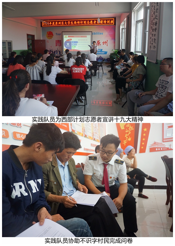 实践过程中,队员们先与宁夏回族自治区固原市原州区团委进行了座谈,了解当地脱贫攻坚政策。此后,实践队为原州区2018年西部计划志愿者、宁夏时迈科技服务有限公司团员青年、河川乡母家沟村农民开展了以“打赢脱贫攻坚战,十九大精神进原州”为主题的十九大精神宣讲活动。宣讲过程中,宣讲团与西部计划志愿者、企业员工以及农民代表进行了交流,并就志愿服务、智慧农业、智慧旅游、惠民政策等进行了热烈的讨论。通过宣讲,让广大青年认识到新时期的青年要立足本职工作,不忘“奉献、友爱、互助、进步”的志愿服务精神,不忘创新创业奉献社会的企业理念,不忘发展生产振兴乡村的致富意识。