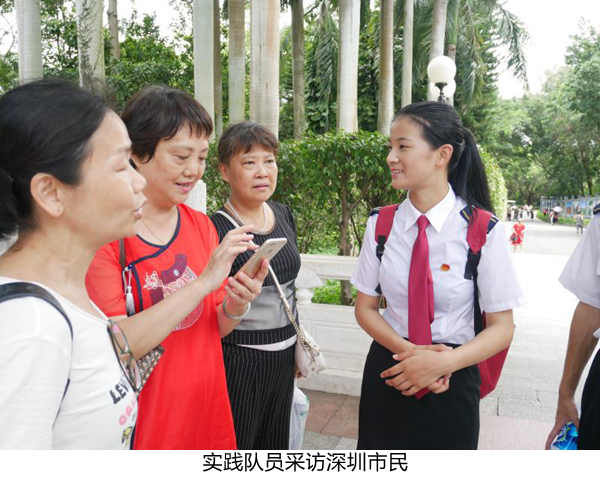 在实践的过程中,实践队沿着中国改革开放前沿第一路——深南大道前行,深入感受着改革开放40年来深圳的变化。地王大厦、京基100、深圳证券交易所、华强北、金融大厦,彰显着城市经济实力的高速增长;深圳博物馆,展现了改革开放以来深圳最前沿的变化;莲花山上的邓小平塑像,体现着这位总设计师的伟大;人才公园内,通过对当地居民的问卷调查以及采访活动,“深圳印象”有了更加深刻的阐释;深圳大学一站,便是高校改革试验田真正的模样……