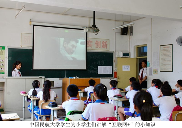 “互联网+”小课堂上,实践队成员向大家介绍“互联网+”的概念、应用以及在生活中对我们的帮助,并且介绍推荐利于大家学习生活的手机应用软件和微信公众号。同时寓教于乐,采用趣味知识问答的方式,让小学生们更加了解“互联网+”小知识和民航小知识。
