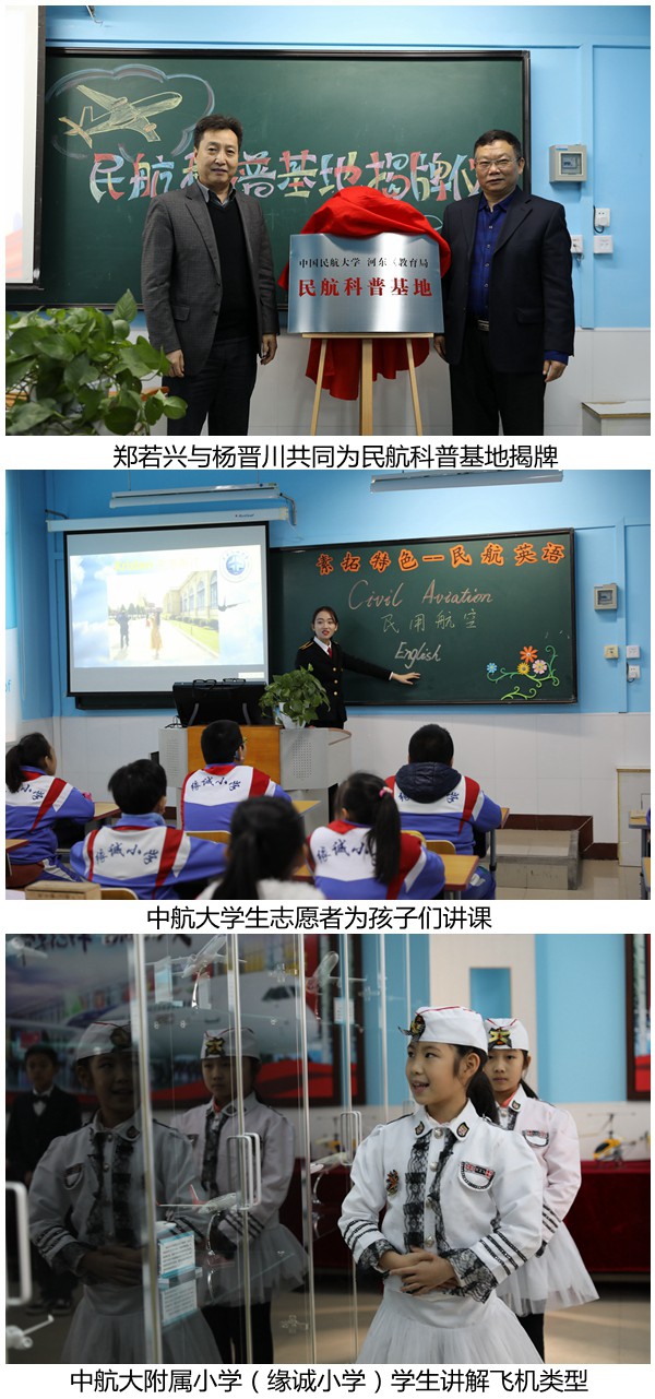 杨晋川指出,在天津市教委和河东区教委的支持下,中航大和缘诚小学共建附属小学,成立民航科普基地是两校合作办学的又一突破。他表示,中航大将会与缘诚小学继续合作,进一步完善民航科普工作。