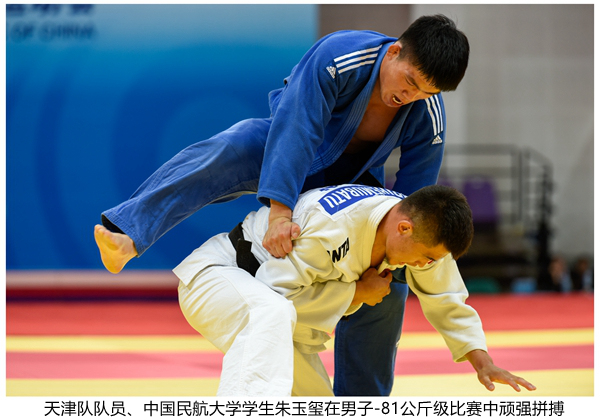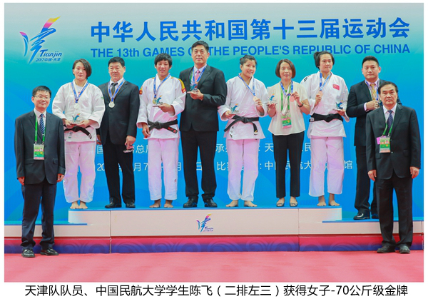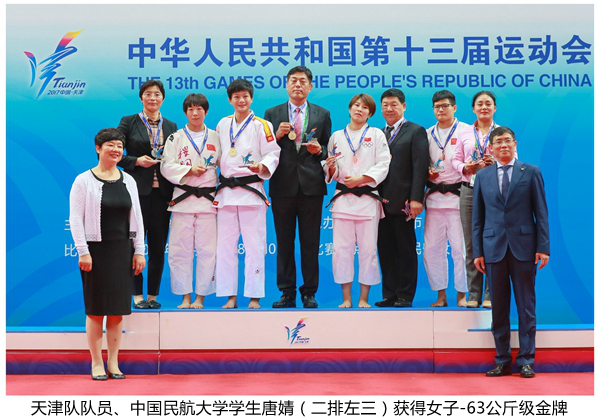 内容提要:8月9日,在中国民航大学体育馆举行的第十三届全运会柔道项目第三个比赛日中,中航大2017级学生、天津柔道女子—63公斤级选手唐婧战胜辽宁选手苏畅,拿下天津柔道队的首金,这也是全运会天津健儿个人项目斩获的首金。另外,2014届毕业生陈飞夺得女子-70公斤级金牌,2013级学生朱玉玺喜获男子-81公斤级银牌。