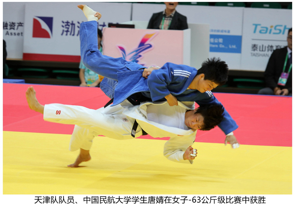在首先进行的女子-63公斤级金牌赛中,中国民航大学2017级新生唐婧对战辽宁选手苏畅,这是唐婧首次在母校参赛。裁判一声令下,唐婧立刻主动向对手发起攻击,双方不断周旋。比赛时间即将结束时双方均未得分,辽宁选手获得两次黄牌警告,进入加时赛。双方在地面交战纠缠时,唐婧抓住时机将对手摔成体侧着地,获得“有效”分,勇摘金牌。