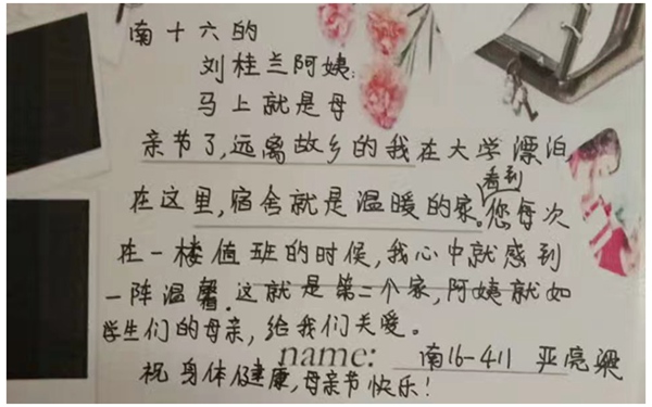 “刘桂兰阿姨,马上就是母亲节了,远离故乡的我在大学漂泊。在这里,宿舍就是温暖的家,看到您每次在一楼值班的时候,我心中就感到一阵温馨。这就是第二个家,阿姨就如我们的母亲,给我们关爱。祝身体健康,母亲节快乐”。
