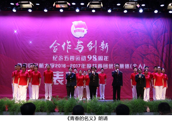 展示环节中,中航大优秀社团代表——模拟联合国协会向大家展示了他们的思维碰撞与自我肯定;中航大团员青年代表的情景朗诵——《青春的名义》散发着新一代青年人的朝气蓬勃、热情奔放。