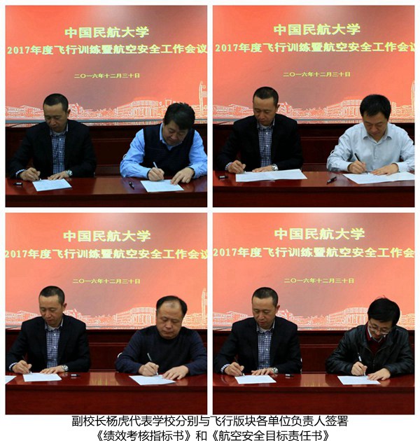 杨虎代表学校分别与飞行技术学院院长杨大鹏、朝阳飞行学院院长庆锋、内蒙古飞行学院院长臧雅霖、天津杰普逊国际飞行学院院长徐建星签署《绩效考核指标书》和《航空安全目标责任书》。
