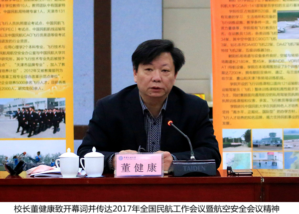 董健康致开幕词并传达2017年全国民航工作会议暨航空安全会议精神。他肯定了各单位所取得的成绩,着重从五个层面提出要求:安全层面,要严在治标,重在治本;方法层面,做好计划和协调,方法不能单一;保障层面,系统全面地抓好安全隐患排查;思想层面,重视小概率事件,问题不过夜,宁可当恶人不当罪人;诚信方面,加固流程,全面反思,全面反省。董健康强调,要系统地分析行业市场的发展,结合通用航空的发展做好学校人员培养的供给侧。