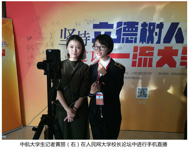 黄丽是外国语学院2014级学生,在本次论坛上与来自全国各高校的10名学生记者,首次用手机直播这一当下最火热的方式向场外观众实时传送论坛盛况。作为校长啦啦队的一员,黄丽对人民网2016大学校长论坛的分论坛二进行了直播。整个过程中,黄丽身着中航大校服展现出民航学子的精神风貌,借直播的机会向广大观众介绍了学校的专业特点和育人特色。