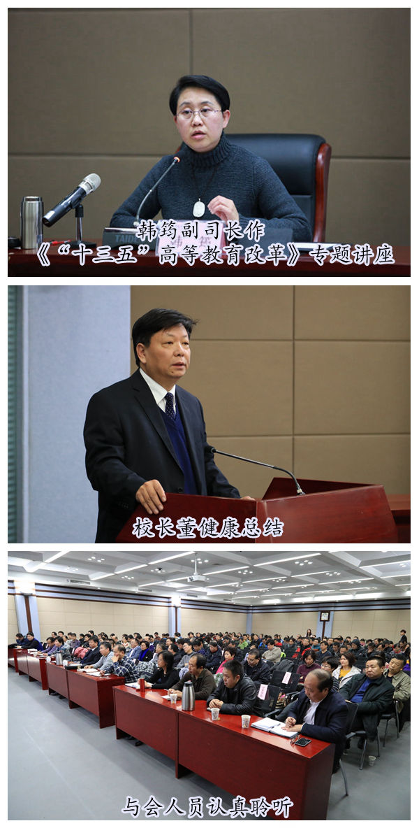 讲座中,韩筠围绕“十三五”高等教育改革,结合具体案例,深入浅出地剖析了我国高等教育改革发展的形势、成就及未来举措。通过对国际、国内形势的深刻分析,她强调指出,教育最重要的产品是人才,高等教育“十三五”的重点是进行结构调整,注重能力培养,根据市场或行业的需求做“削枝强干”的工作。