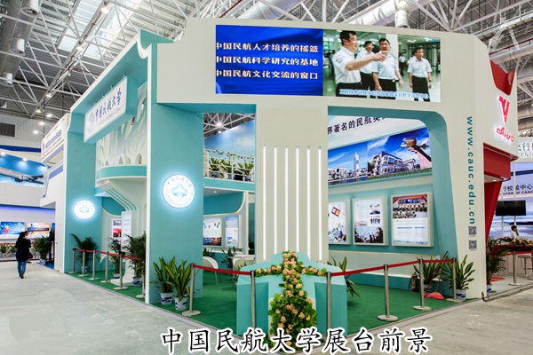 来到中国民航大学展台,学校logo演绎而出的飞机造型映入眼帘,沿着飞机机头方向依次向上看去,间隔式灯带形成一条飞机跑道,映射出今年展出的主题“助人成长·助业兴旺”。“建设享有国际声誉的世界著名的民航类高等学府”的副标题展示出学校立足民航、服务社会、面向世界的办学理念以及学校“十三五”规划的目标。标题下方学校地标性建筑的照片与学校新校区规划设计图相呼应,让参观者置身其中感受远在北方的中航大实景校区的魅力。