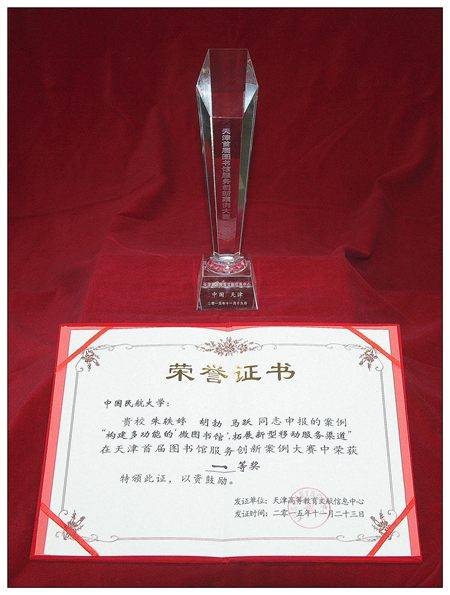 2015年11月23日,由天津市高等教育文献信息中心主办的首届天津高校图书馆服务创新案例大赛在天津财经大学举行。经过激烈角逐,中航大代表队以优异的工作业绩和良好的现场发挥,赢得了专家评委和大众评委的一致肯定,获得总分第一名、荣获大赛一等奖