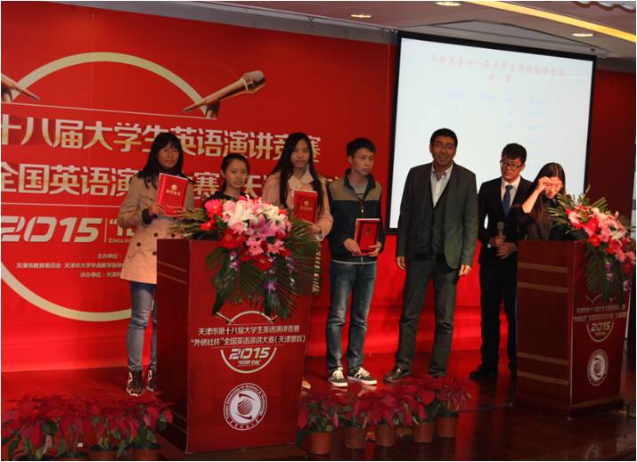 2015年11月1日,“2015‘外研社杯’全国大学生英语演讲及写作大赛”天津市决赛落下帷幕,中国民航大学石亚超(图中)荣获写作比赛一等奖
