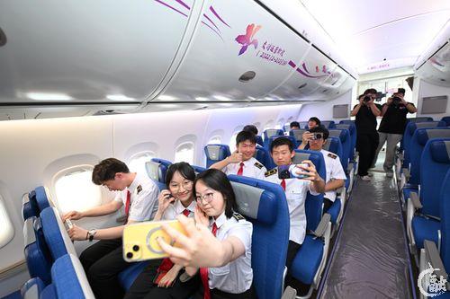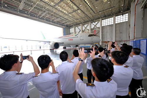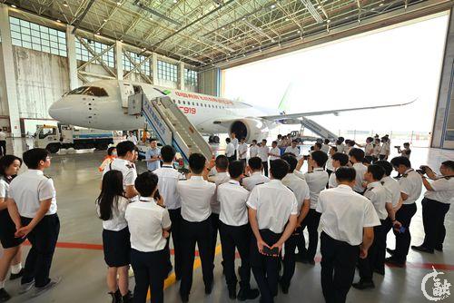 刚进入机库,民航大学的学生们就被C919大飞机吸引,纷纷拿出手机拍照纪念