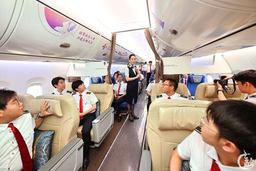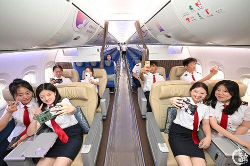 C919大飞机的空乘讲解员在给学生们讲解C919与其他飞机的区别之处