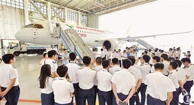 在中国民航大学(以下简称中航大)机库内,一架白色涂装的C919飞机静静停放着,吸引不少中航大师生前来观摩。