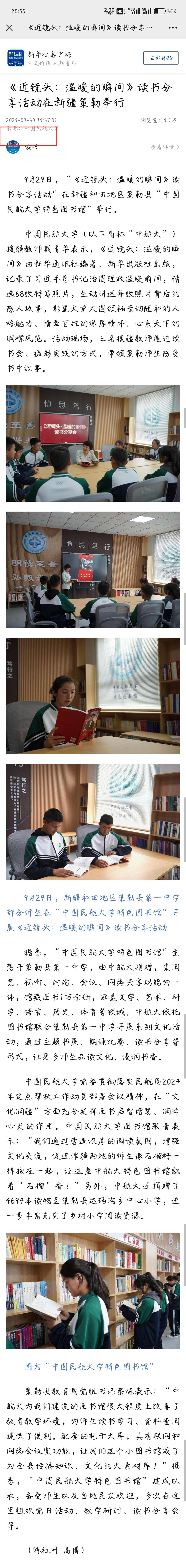 9月29日,“《近镜头:温暖的瞬间》读书分享活动”在新疆和田地区策勒县“中国民航大学特色图书馆”举行。