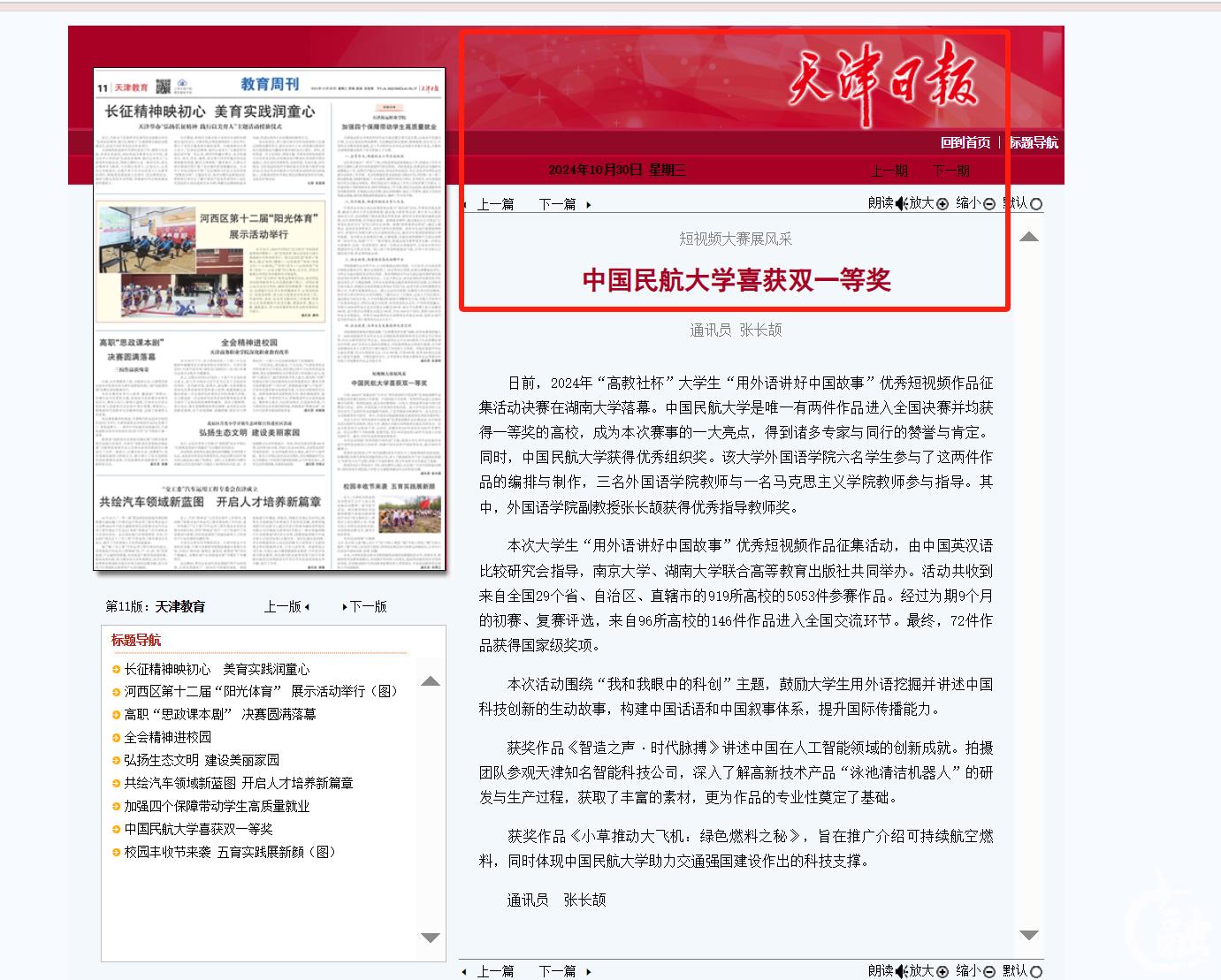 日前,2024年“高教社杯”大学生“用外语讲好中国故事”优秀短视频作品征集活动决赛在湖南大学落幕。中国民航大学是唯一有两件作品进入全国决赛并均获得一等奖的高校,成为本次赛事的一大亮点,得到诸多专家与同行的赞誉与肯定。同时,中国民航大学获得优秀组织奖。该大学外国语学院六名学生参与了这两件作品的编排与制作,三名外国语学院教师与一名马克思主义学院教师参与指导。其中,外国语学院副教授张长颉获得优秀指导教师奖。