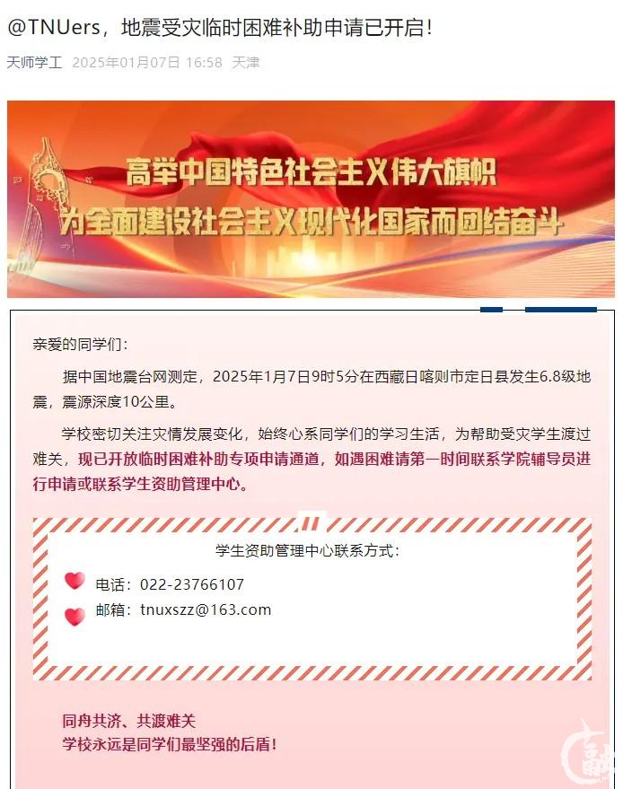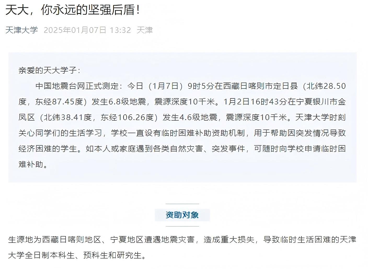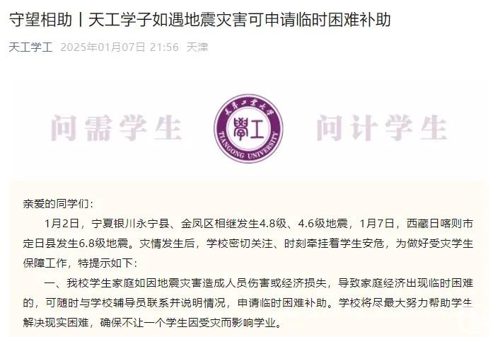 1月7日,“天津大学”微信公众号发布消息,生源地为西藏日喀则地区、宁夏地区遭遇地震灾害,造成重大损失,导致临时生活困难的天津大学全日制本科生、预科生和研究生。资助政策受灾情影响较为严重、影响个人生活学习的同学,可联系辅导员,通过学院向学校资助管理中心申请临时困难补助。