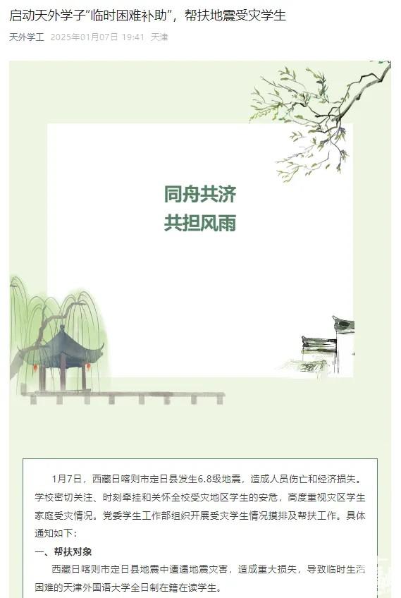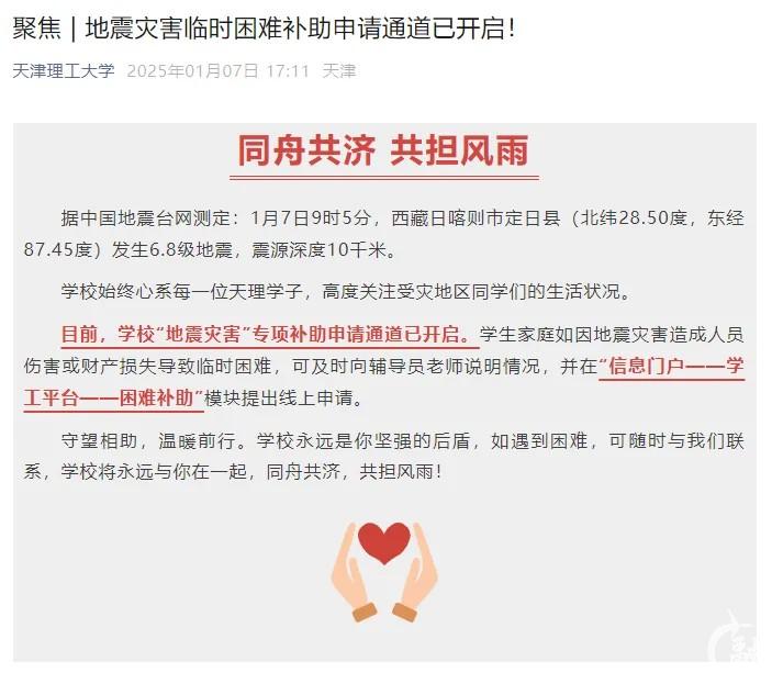1月7日9时5分,西藏日喀则市定日县发生6.8级地震。此前的1月2日,宁夏银川永宁县、金凤区也相继发生4.8级、4.6级地震。据不完全统计,1月7日-8日,天津多所高校发出通知,开展学生家庭受灾情况排查工作,开启临时困难补助通道,帮学子渡过难关。