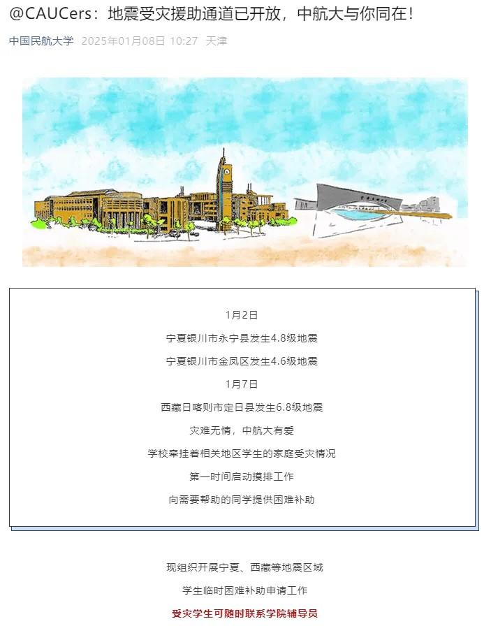“中国民航大学”微信公众号今日发布消息,组织开展宁夏、西藏等地震区域,学生临时困难补助申请工作受灾学生可随时联系学院辅导员或学校资助管理中心,学校会第一时间进行困难帮扶,竭力为同学们排忧解难,全力做好帮扶保障工作。