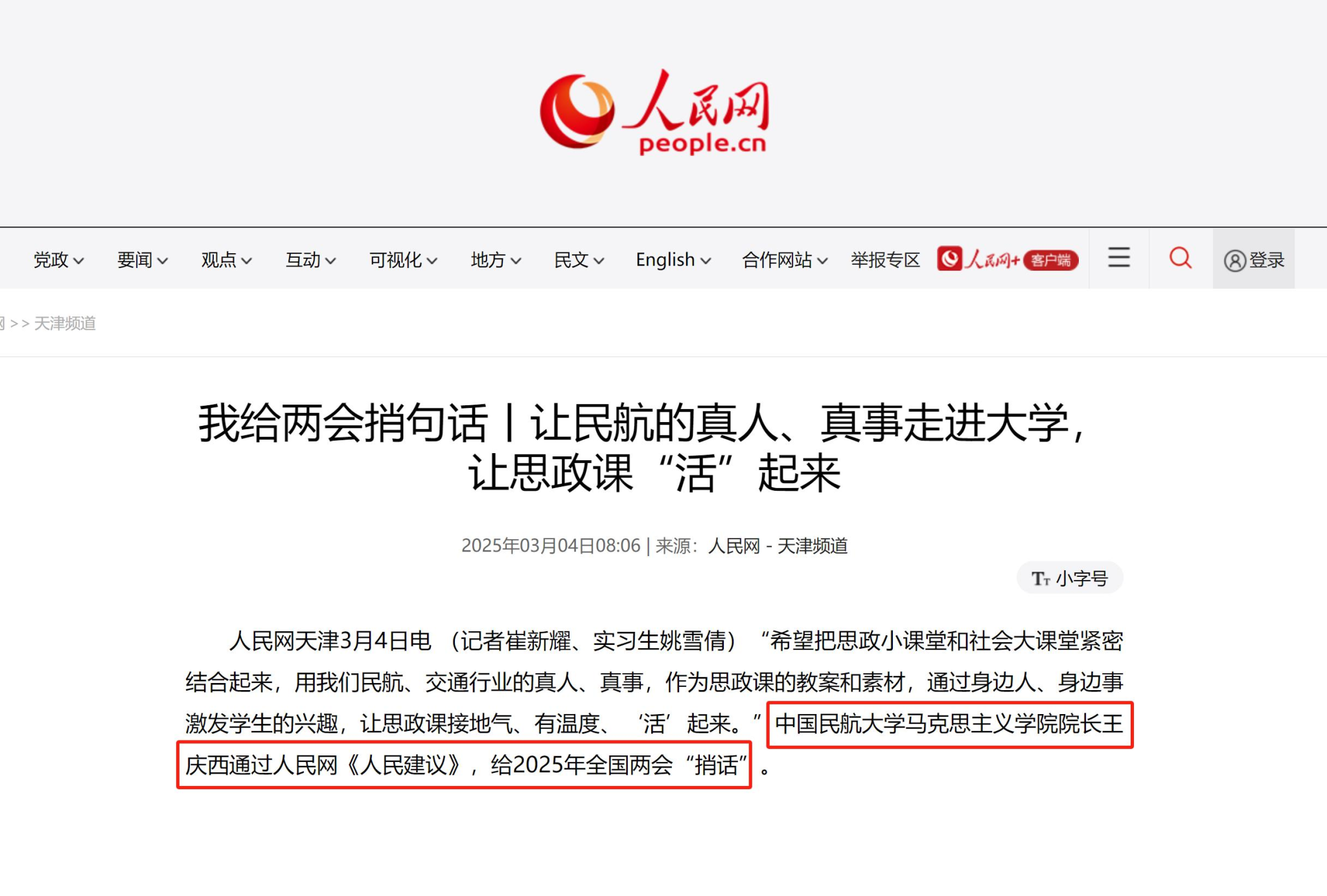 “希望把思政小课堂和社会大课堂紧密结合起来,用我们民航、交通行业的真人、真事,作为思政课的教案和素材,通过身边人、身边事激发学生的兴趣,让思政课接地气、有温度、‘活’起来。”中国民航大学马克思主义学院院长王庆西通过人民网《人民建议》,给2025年全国两会“捎话”。