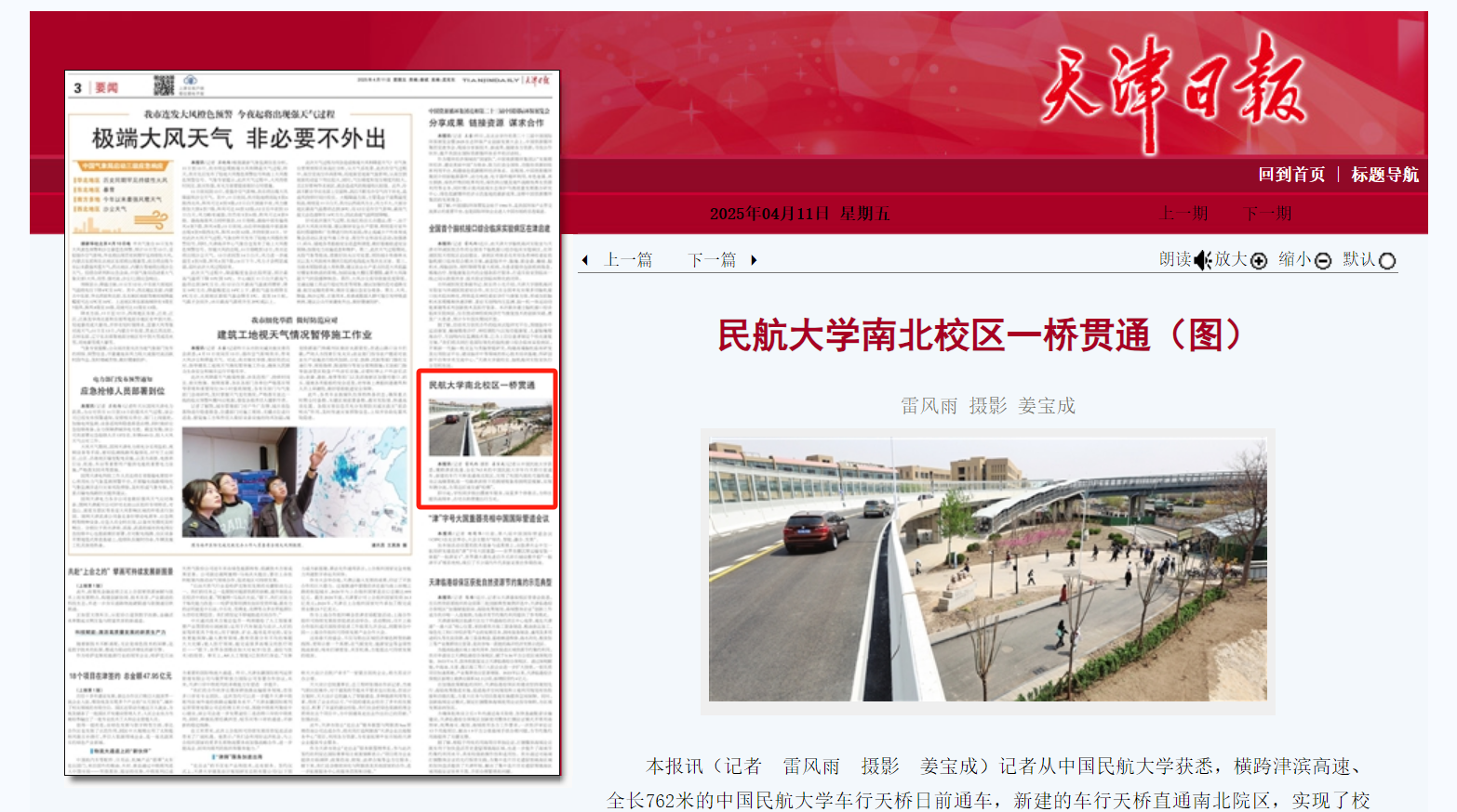 本报讯(记者 雷风雨 摄影 姜宝成)记者从中国民航大学获悉,横跨津滨高速、全长762米的中国民航大学车行天桥日前通车,新建的车行天桥直通南北院区,实现了校园内部的无缝衔接,也让高峰期机场一号路津滨桥下的拥堵现象得到明显缓解,实现车辆分流,为周边区域交通“松绑”。