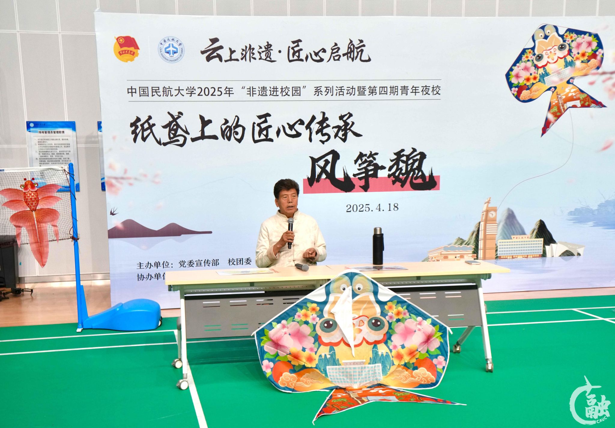 活动特邀“风筝魏”第四代传承人魏国秋先生主讲,通过现场演示风筝制作的关键步骤,展示了“以竹为骨、以绢为翼”的传统工艺,魏国秋向同学们讲述“风筝魏”的历史起源、艺术价值和制作工艺,进行风筝“扎、糊、绘、放”的现场教学,现场展示的风筝具有造型多变、彩绘逼真、飞行平稳、特技精湛、便于携带的独特风格。