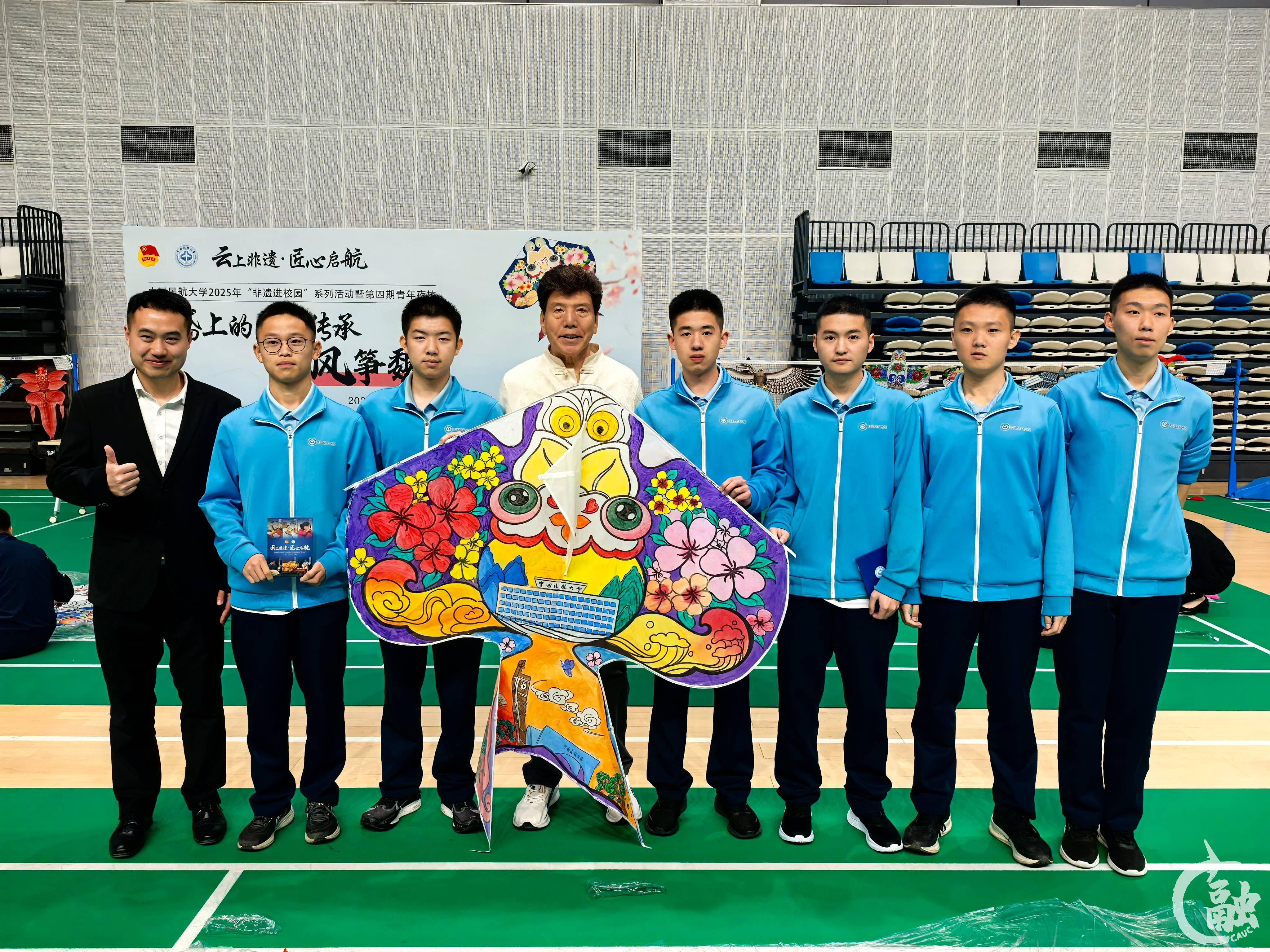 同学们带着绘制作品和非遗大师合影 来源:中国民航大学