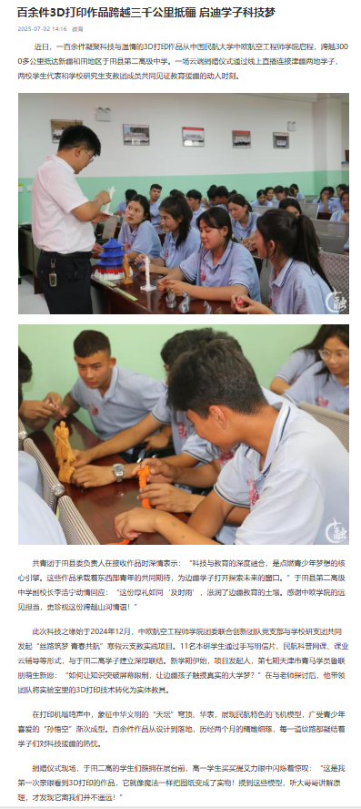 近日,一百余件凝聚科技与温情的3D打印作品从中国民航大学中欧航空工程师学院启程,跨越3000多公里抵达新疆和田地区于田县第二高级中学。一场云端捐赠仪式通过线上直播连接津疆两地学子,两校学生代表和学校研究生支教团成员共同见证教育援疆的动人时刻。