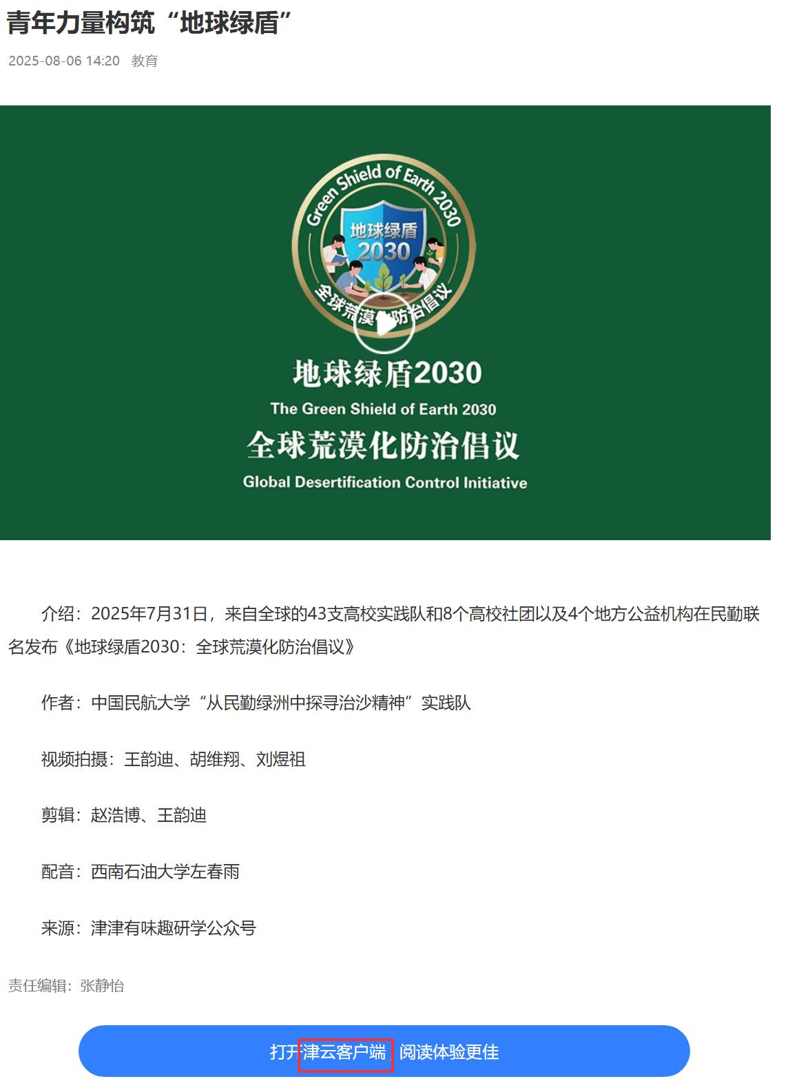 介绍:2025年7月31日,来自全球的43支高校实践队和8个高校社团以及4个地方公益机构在民勤联名发布《地球绿盾2030:全球荒漠化防治倡议》