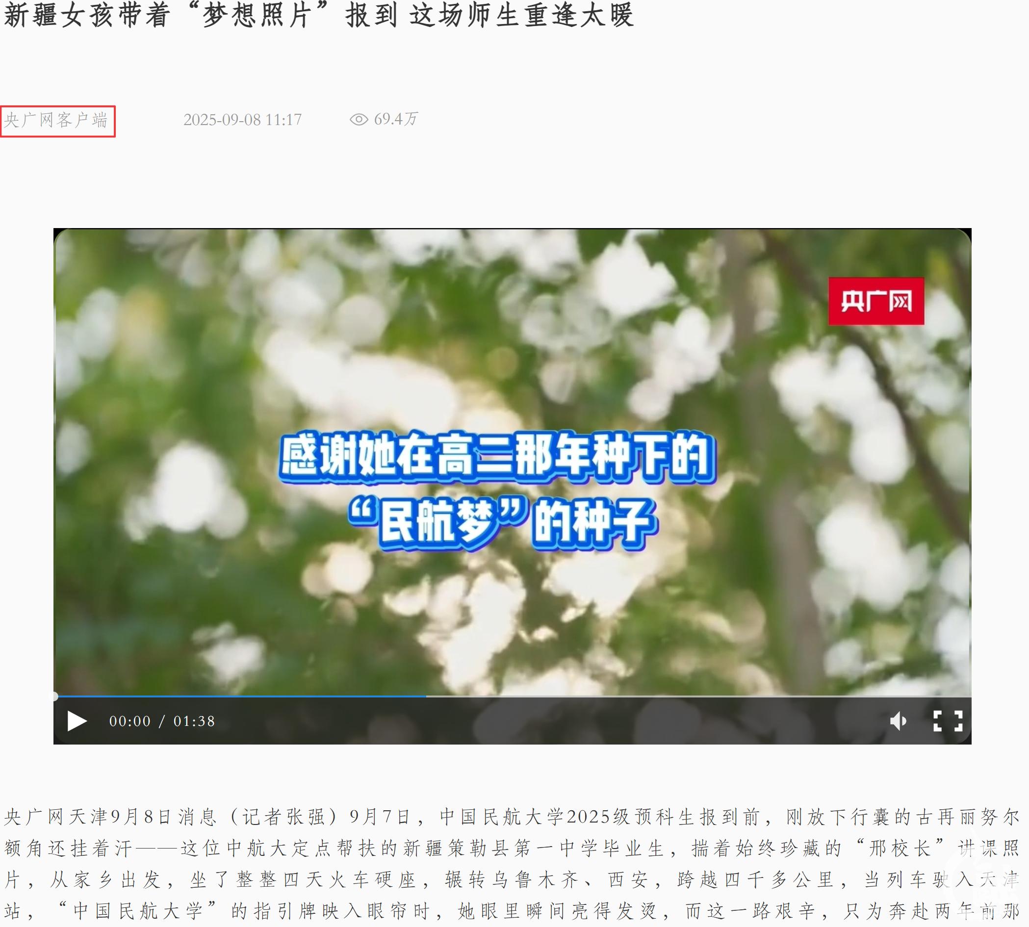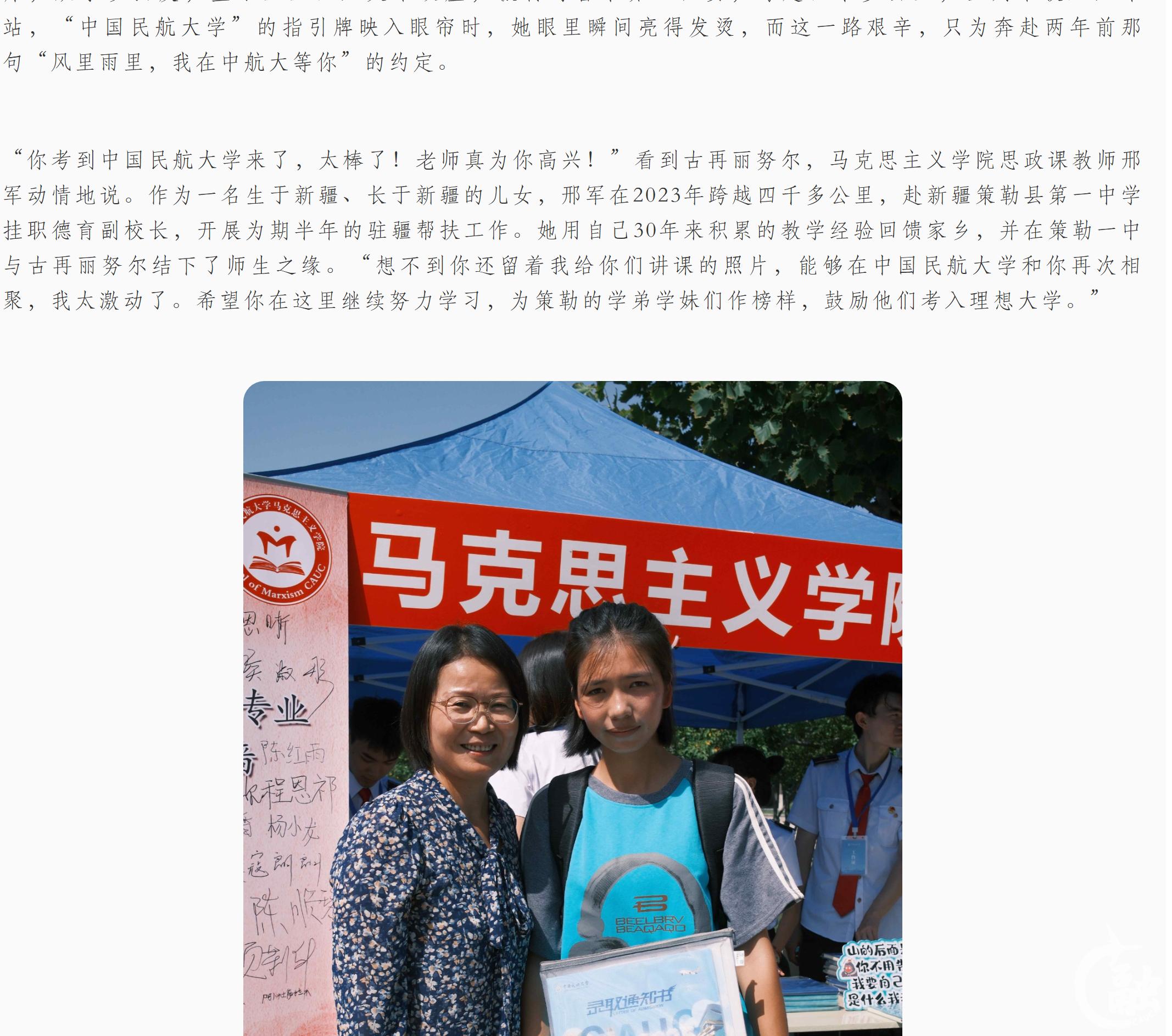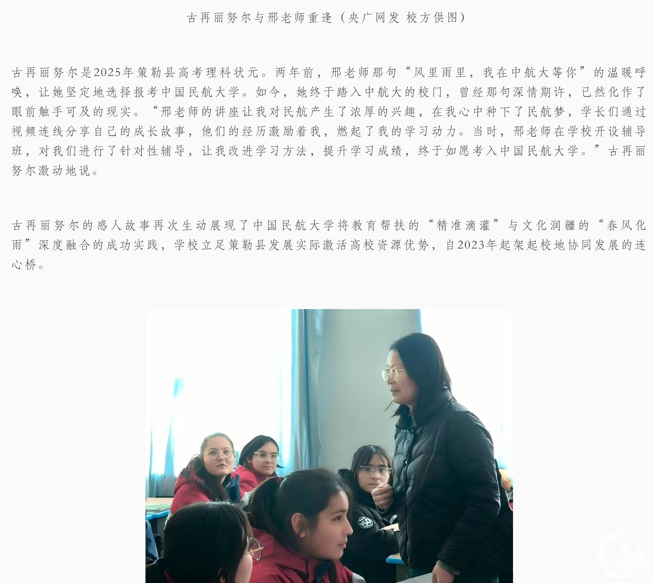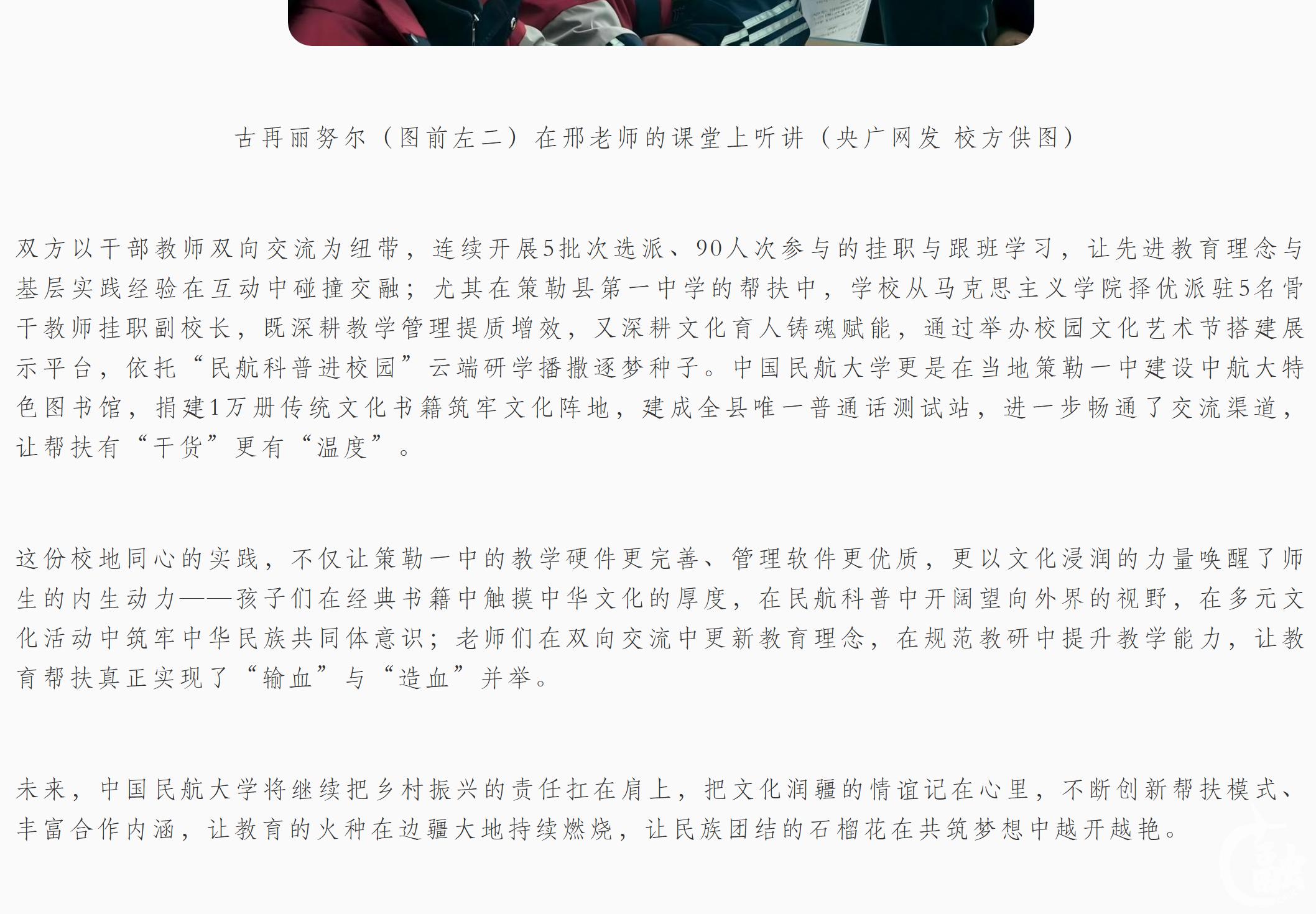 古再丽努尔的感人故事再次生动展现了中国民航大学将教育帮扶的“精准滴灌”与文化润疆的“春风化雨”深度融合的成功实践,学校立足策勒县发展实际激活高校资源优势,自2023年起架起校地协同发展的连心桥。