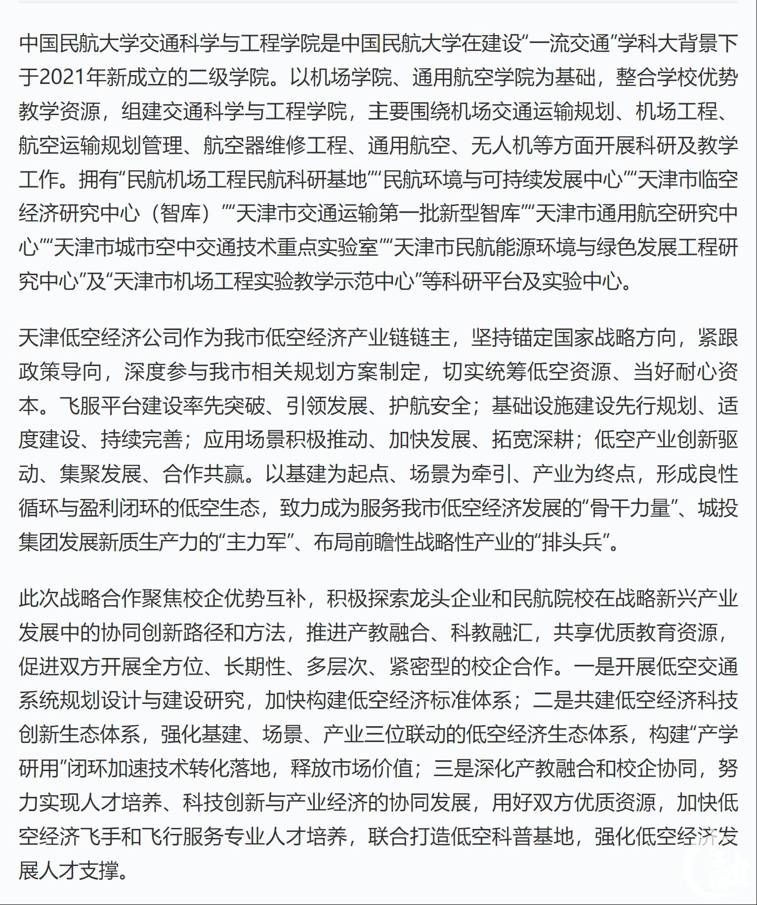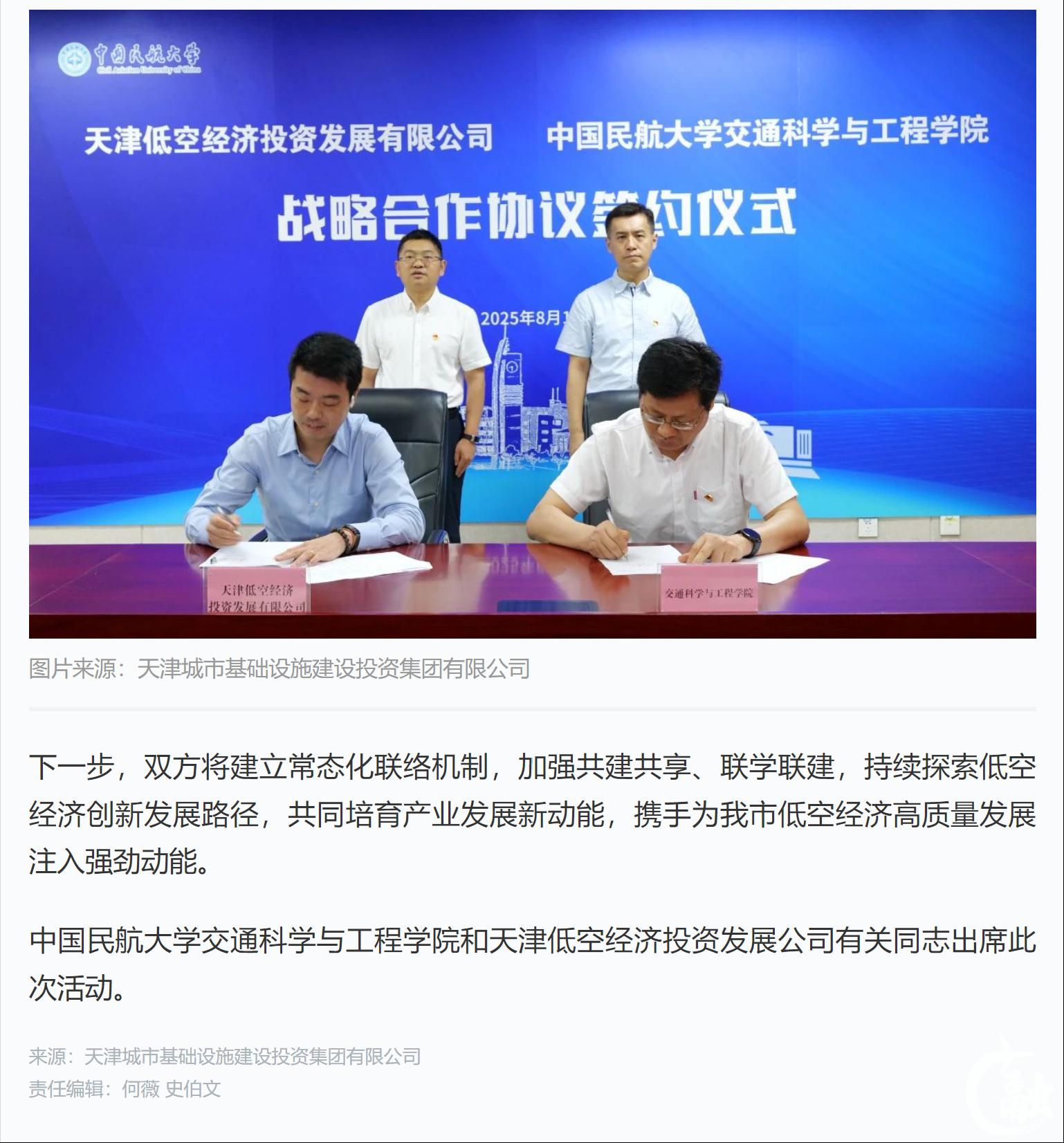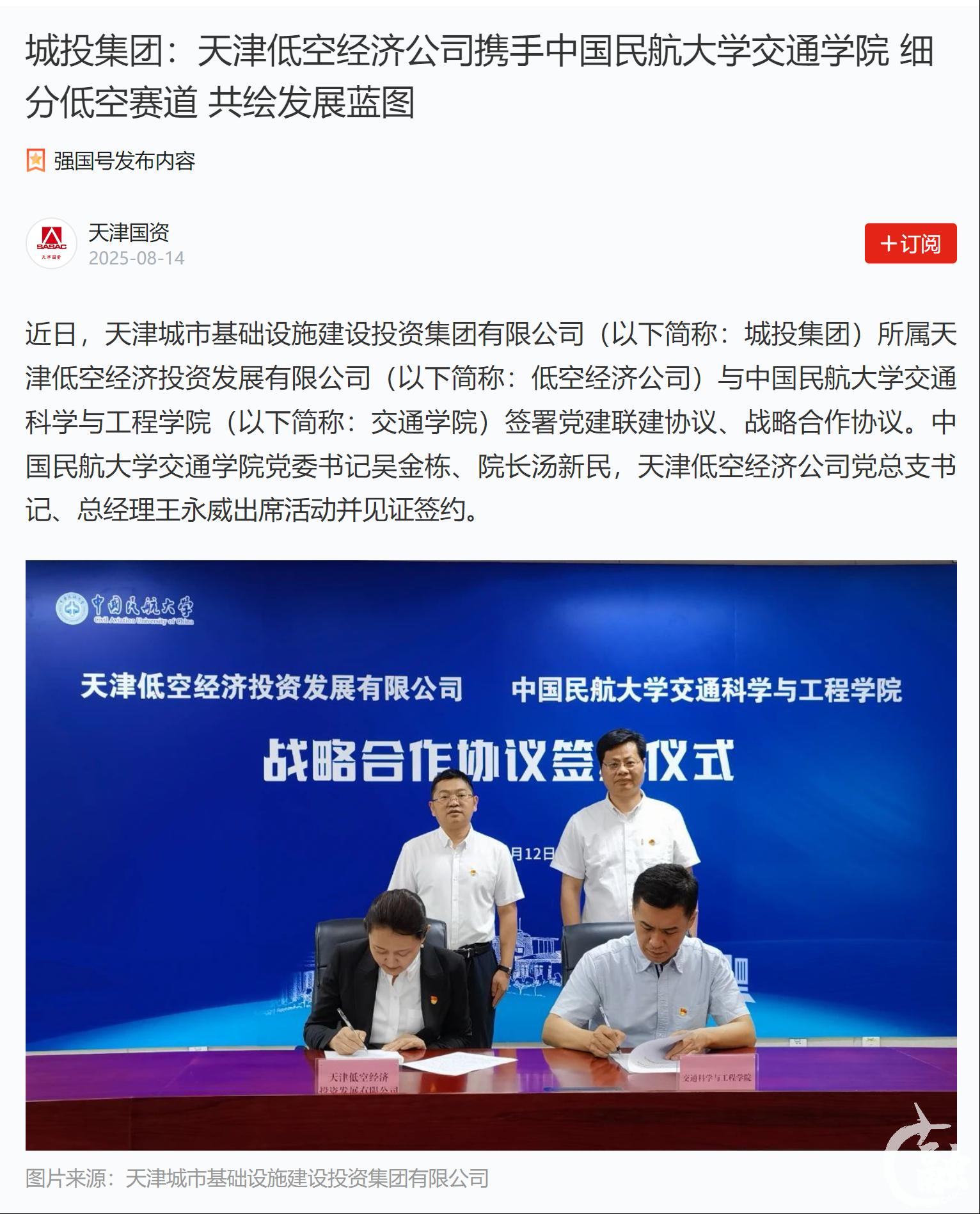 城投集团:天津低空经济公司携手中国民航大学交通学院 细分低空赛道 共绘发展蓝图
