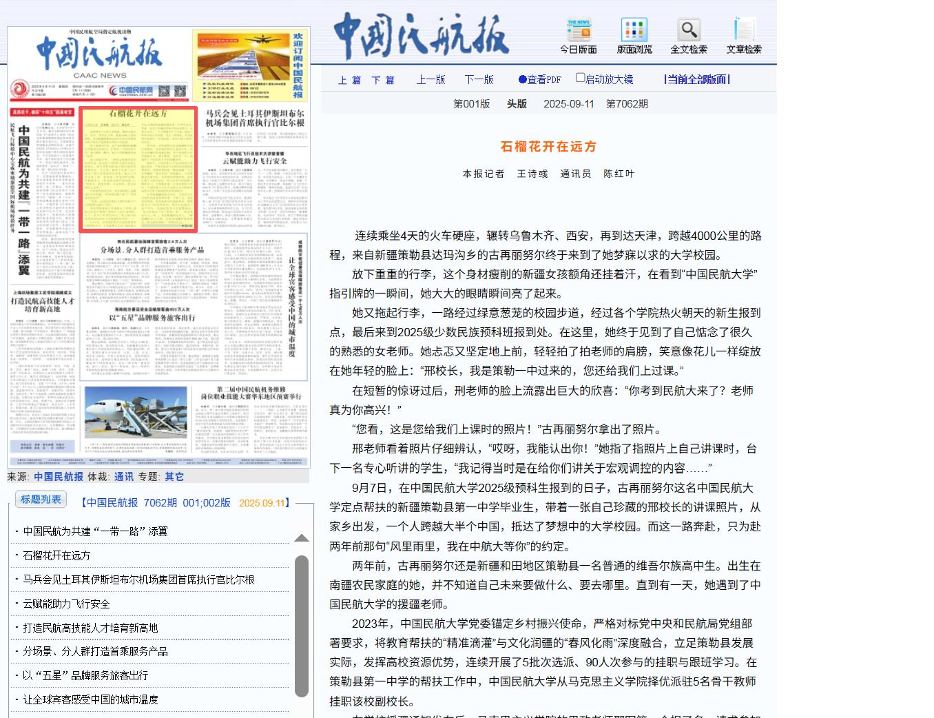 在援疆老师们的指导和帮助下,古再丽努尔对民航产生了浓厚的兴趣,在心中种下了民航的种子。她为了梦想刻苦学习,终于在2025年成为策勒县高考理科状元。在填写志愿时,她坚定地选择报考中国民航大学。