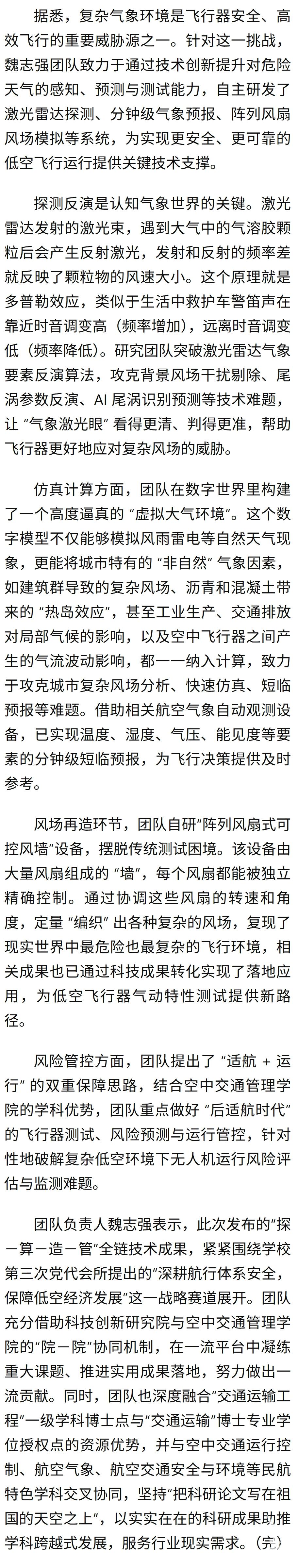 团队负责人魏志强表示,此次发布的“探-算-造-管”全链技术成果,紧紧围绕学校第三次党代会所提出的“深耕航行体系安全,保障低空经济发展”这一战略赛道展开。团队充分借助科技创新研究院与空中交通管理学院的“院-院”协同机制,在一流平台中凝练重大课题、推进实用成果落地,努力做出一流贡献。同时,团队也深度融合“交通运输工程”一级学科博士点与“交通运输”博士专业学位授权点的资源优势,并与空中交通运行控制、航空气象、航空交通安全与环境等民航特色学科交叉协同,坚持“把科研论文写在祖国的天空之上”,以实实在在的科研成果助推学科跨越式发展,服务行业现实需求。