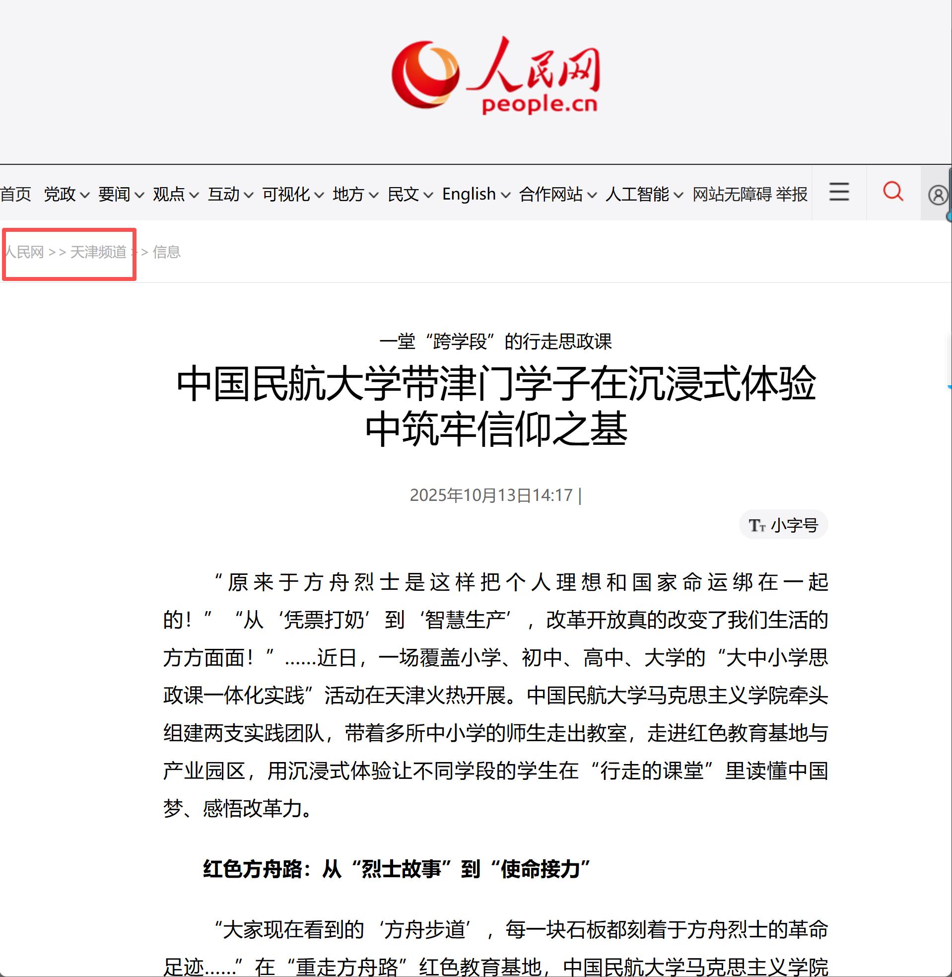 “原来于方舟烈士是这样把个人理想和国家命运绑在一起的!”“从‘凭票打奶’到‘智慧生产’,改革开放真的改变了我们生活的方方面面!”……近日,一场覆盖小学、初中、高中、大学的“大中小学思政课一体化实践”活动在天津火热开展。中国民航大学马克思主义学院牵头组建两支实践团队,带着多所中小学的师生走出教室,走进红色教育基地与产业园区,用沉浸式体验让不同学段的学生在“行走的课堂”里读懂中国梦、感悟改革力。