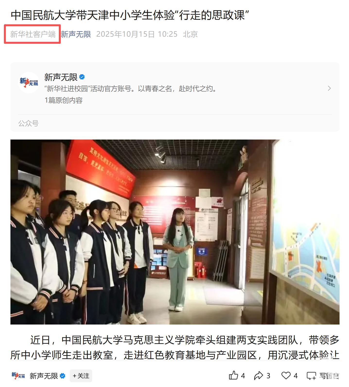 近日,中国民航大学马克思主义学院牵头组建两支实践团队,带领多所中小学师生走出教室,走进红色教育基地与产业园区,用沉浸式体验让不同学段的学生在“行走的课堂”里读懂中国梦、感悟改革力。