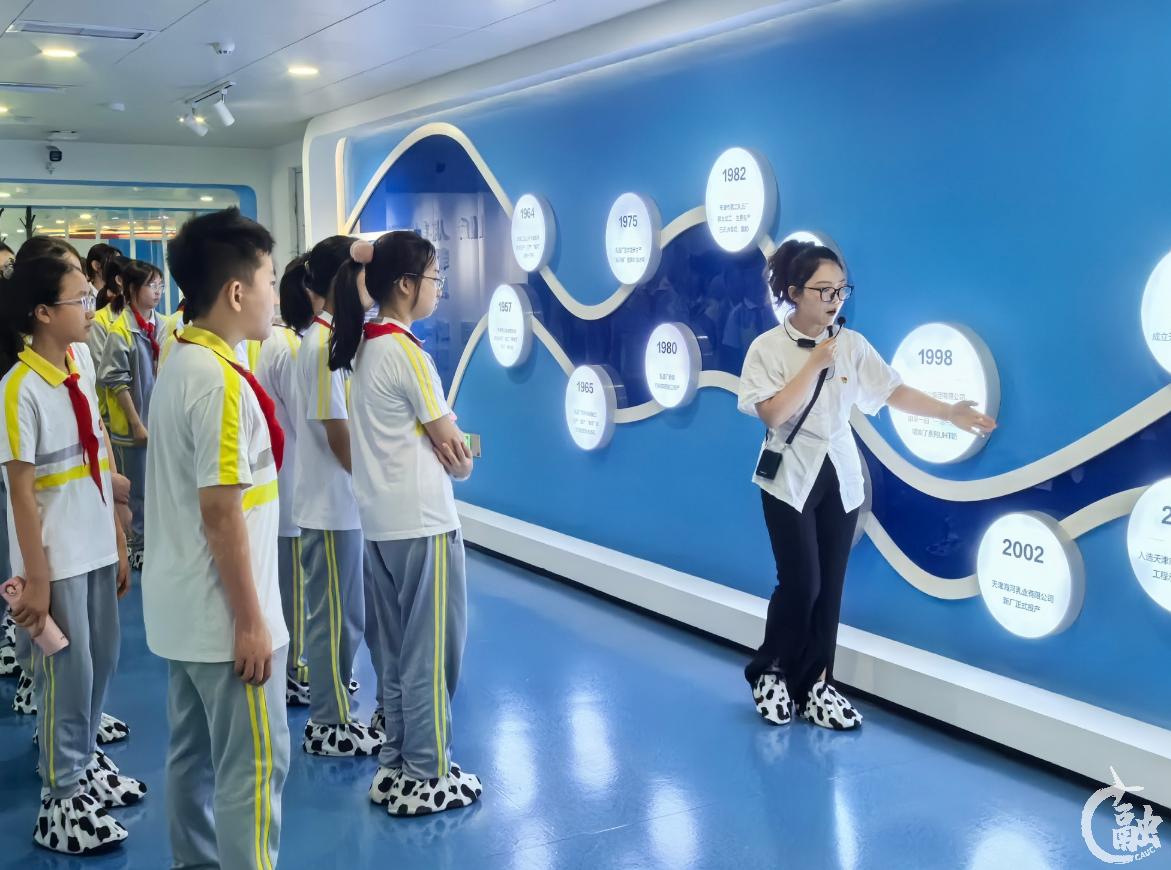 “小朋友们,你们知道爷爷小时候买牛奶要凭什么吗?”在海河乳品智慧工厂,邵明雪老师举起一张泛黄的“牛奶供应票”,瞬间勾起孩子们的好奇心。跟着生产线的“脚步”,学生们看到从过去“排队凭票打奶”,到如今智能设备精准灌装、全程冷链配送,老字号乳品厂的“变身”,成了改革开放最鲜活的“生活教材”。