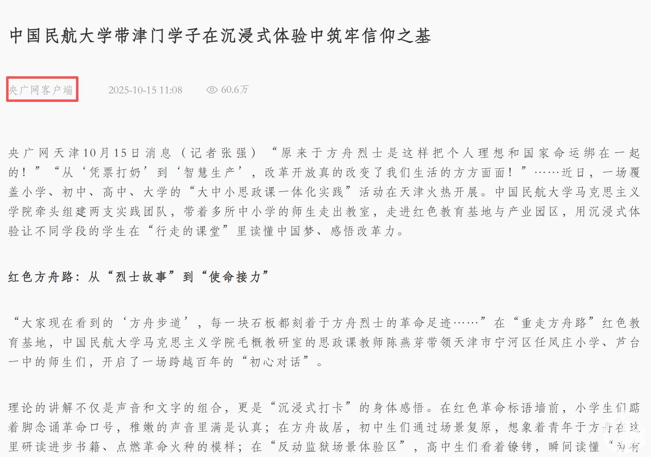 央广网天津10月15日消息(记者张强)“原来于方舟烈士是这样把个人理想和国家命运绑在一起的!”“从‘凭票打奶’到‘智慧生产’,改革开放真的改变了我们生活的方方面面!”……近日,一场覆盖小学、初中、高中、大学的“大中小思政课一体化实践”活动在天津火热开展。中国民航大学马克思主义学院牵头组建两支实践团队,带着多所中小学的师生走出教室,走进红色教育基地与产业园区,用沉浸式体验让不同学段的学生在“行走的课堂”里读懂中国梦、感悟改革力。