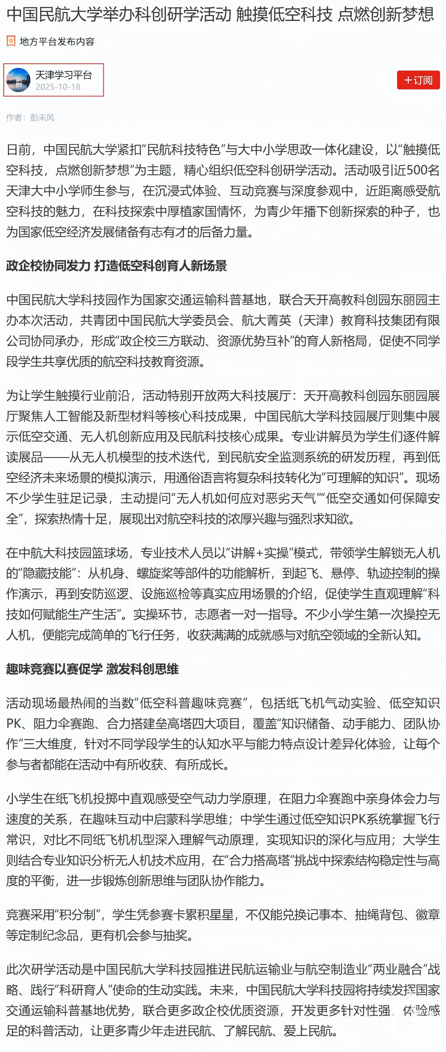 中国民航大学科技园作为国家交通运输科普基地,联合天开高教科创园东丽园主办本次活动,共青团中国民航大学委员会、航大菁英(天津)教育科技集团有限公司协同承办,形成“政企校三方联动、资源优势互补”的育人新格局,促使不同学段学生共享优质的航空科技教育资源。
