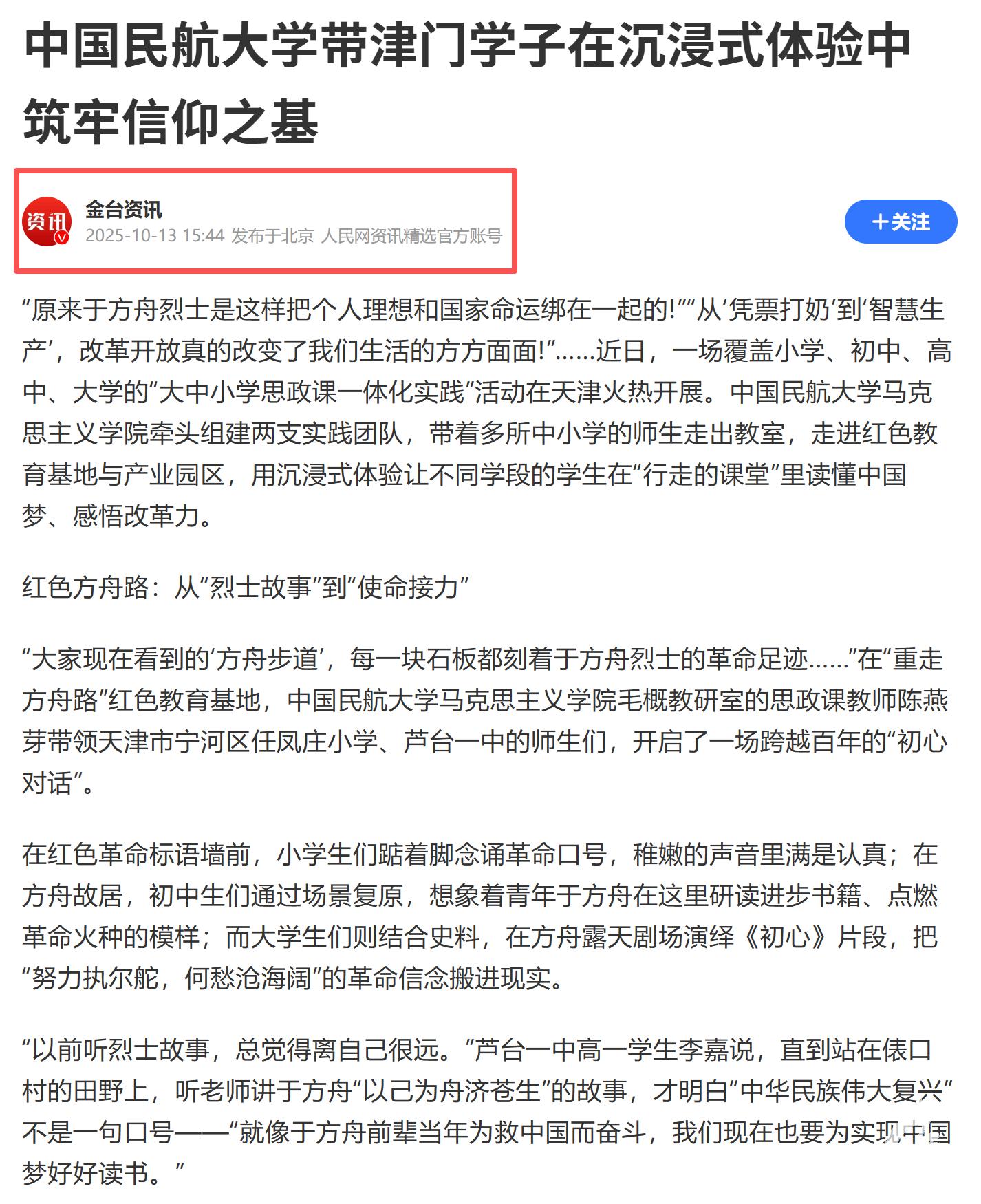 “原来于方舟烈士是这样把个人理想和国家命运绑在一起的!”“从‘凭票打奶’到‘智慧生产’,改革开放真的改变了我们生活的方方面面!”……近日,一场覆盖小学、初中、高中、大学的“大中小学思政课一体化实践”活动在天津火热开展。中国民航大学马克思主义学院牵头组建两支实践团队,带着多所中小学的师生走出教室,走进红色教育基地与产业园区,用沉浸式体验让不同学段的学生在“行走的课堂”里读懂中国梦、感悟改革力。