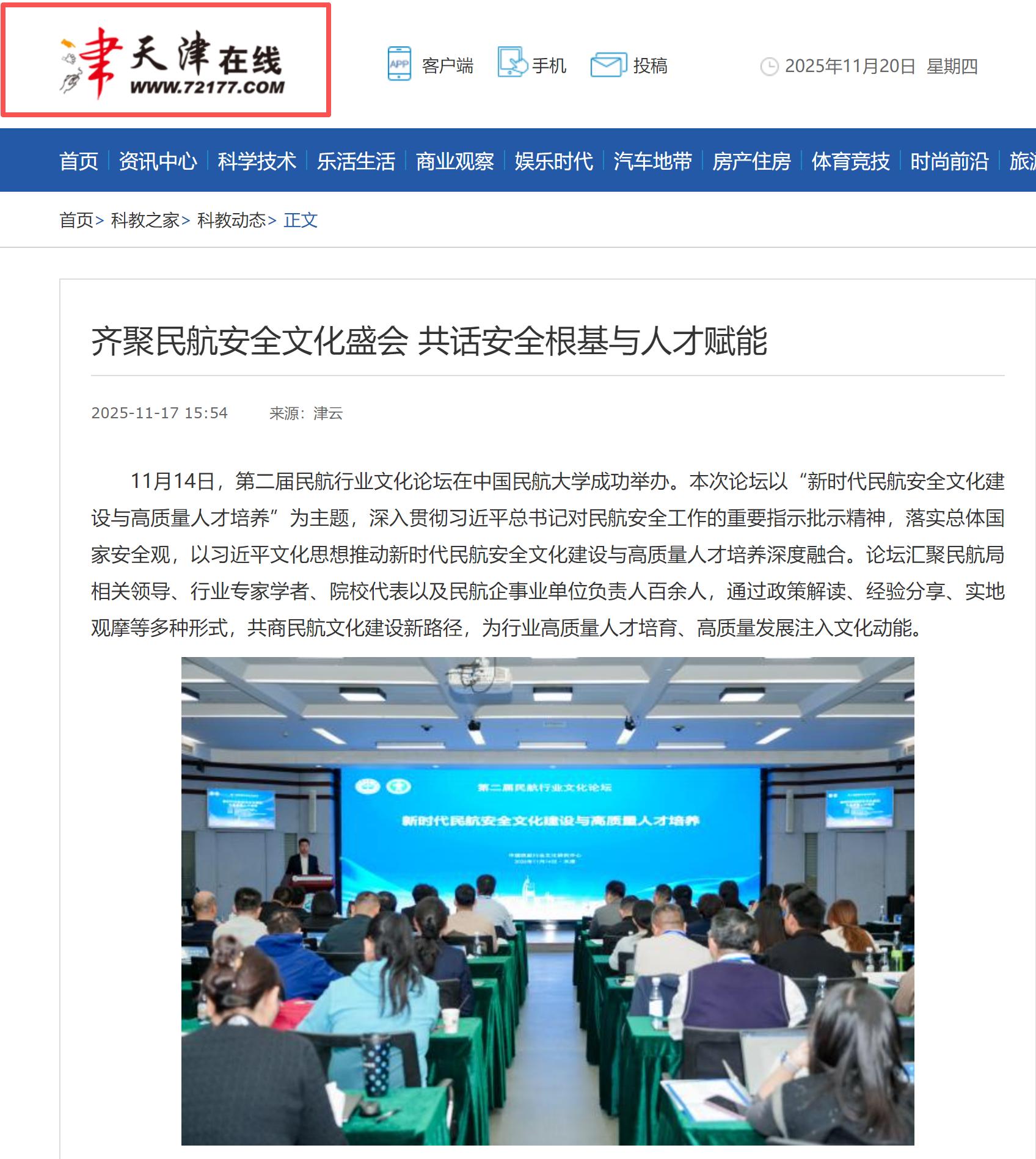 11月14日,第二届民航行业文化论坛在中国民航大学成功举办。本次论坛以“新时代民航安全文化建设与高质量人才培养”为主题,深入贯彻习近平总书记对民航安全工作的重要指示批示精神,落实总体国家安全观,以习近平文化思想推动新时代民航安全文化建设与高质量人才培养深度融合。论坛汇聚民航局相关领导、行业专家学者、院校代表以及民航企事业单位负责人百余人,通过政策解读、经验分享、实地观摩等多种形式,共商民航文化建设新路径,为行业高质量人才培育、高质量发展注入文化动能。