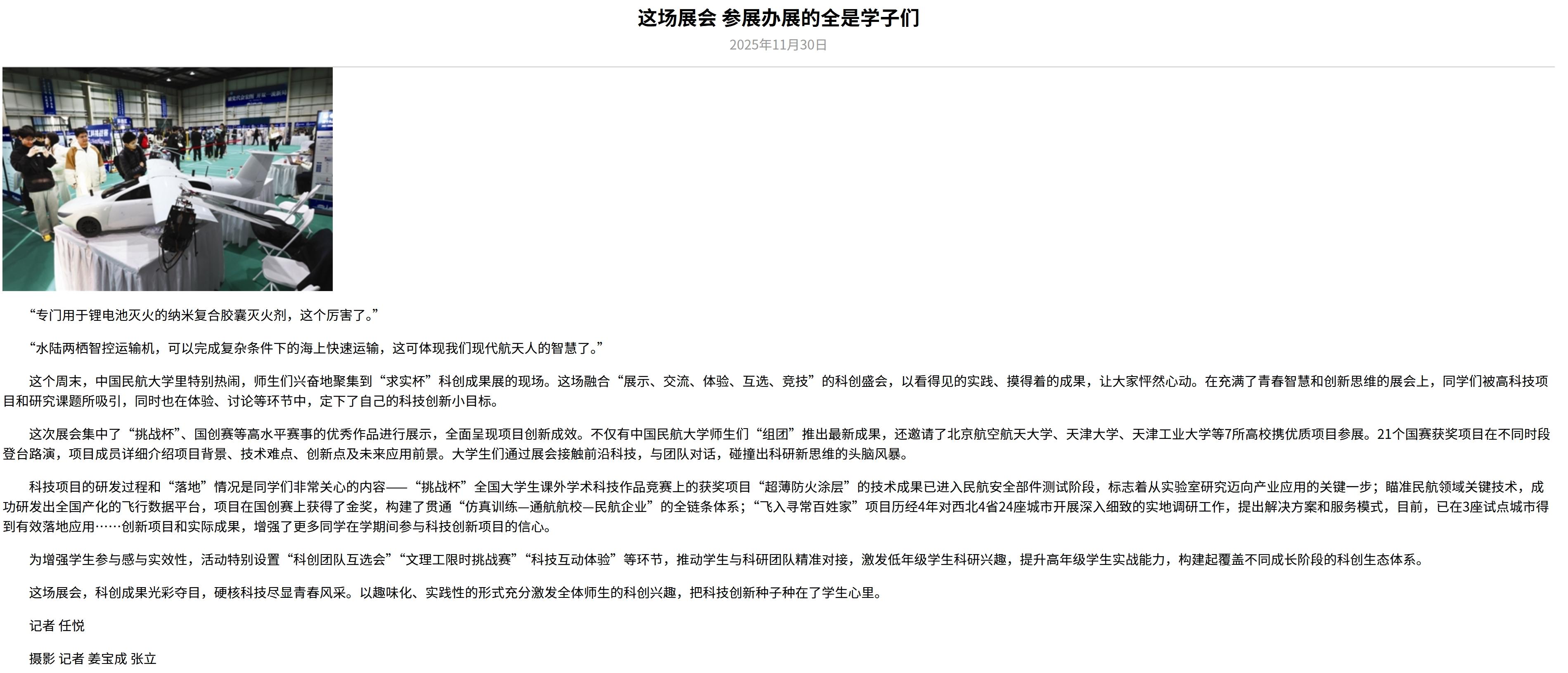 这次展会集中了“挑战杯”、国创赛等高水平赛事的优秀作品进行展示,全面呈现项目创新成效。不仅有中国民航大学师生们“组团”推出最新成果,还邀请了北京航空航天大学、天津大学、天津工业大学等7所高校携优质项目参展。21个国赛获奖项目在不同时段登台路演,项目成员详细介绍项目背景、技术难点、创新点及未来应用前景。大学生们通过展会接触前沿科技,与团队对话,碰撞出科研新思维的头脑风暴。