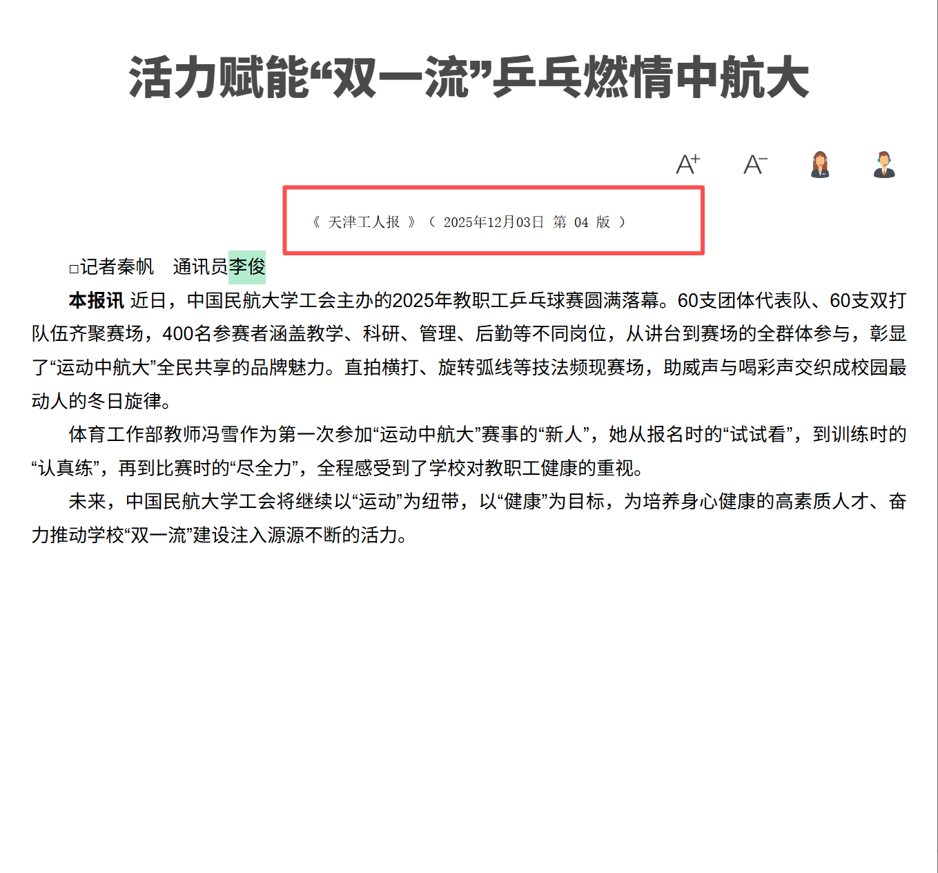 《天津工人报》:活力赋能“双一流”乒乓燃情中航大