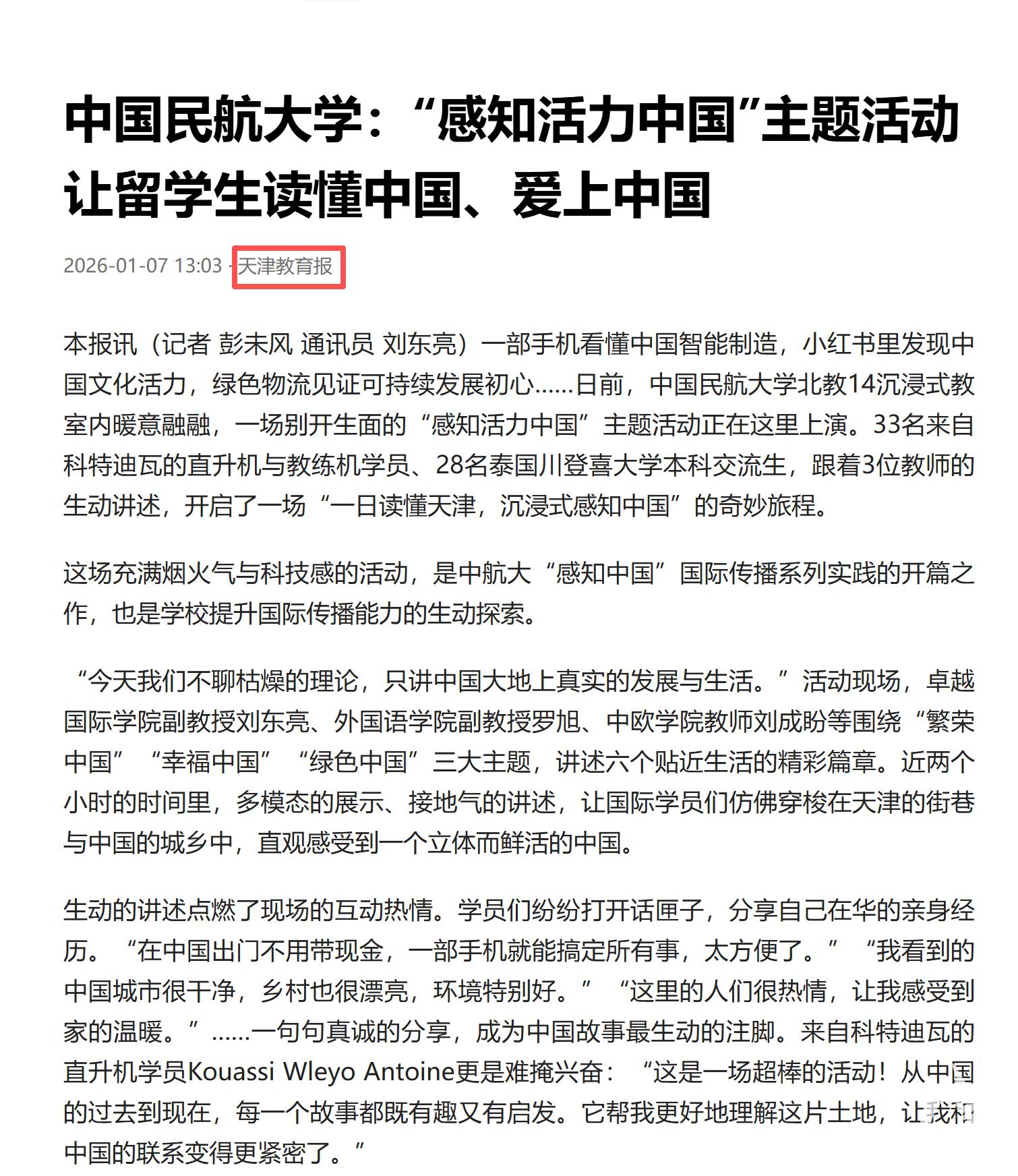 《天津教育报》:中国民航大学:“感知活力中国”主题活动让留学生读懂中国、爱上中国