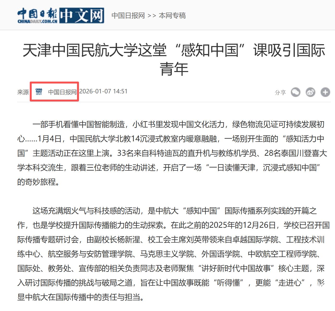 《中国日报》中文网:天津中国民航大学这堂“感知中国”课吸引国际青年