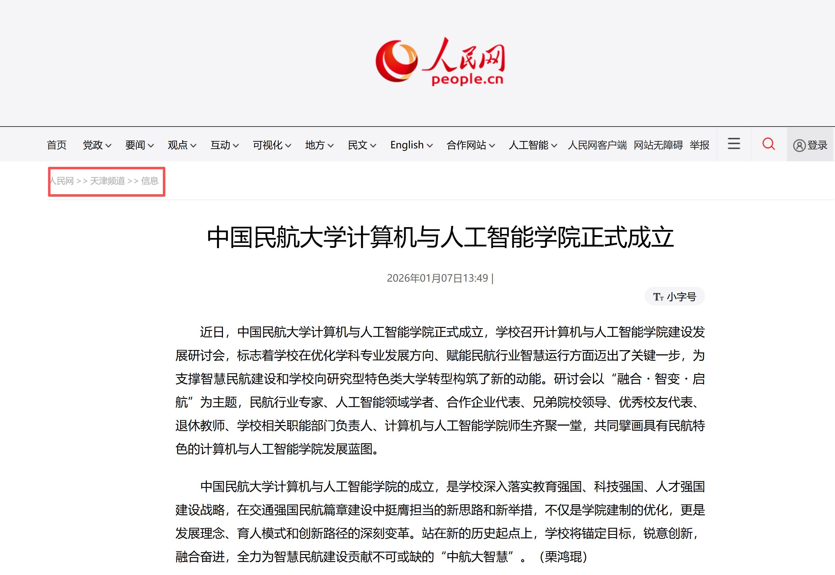 人民网 天津频道:中国民航大学计算机与人工智能学院正式成立