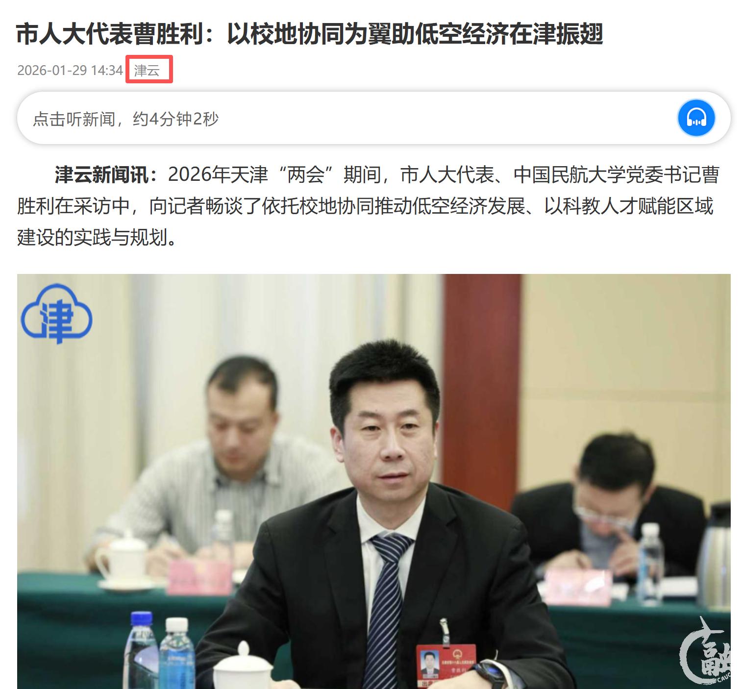2026年天津“两会”期间,市人大代表、中国民航大学党委书记曹胜利在采访中,向记者畅谈了依托校地协同推动低空经济发展、以科教人才赋能区域建设的实践与规划。