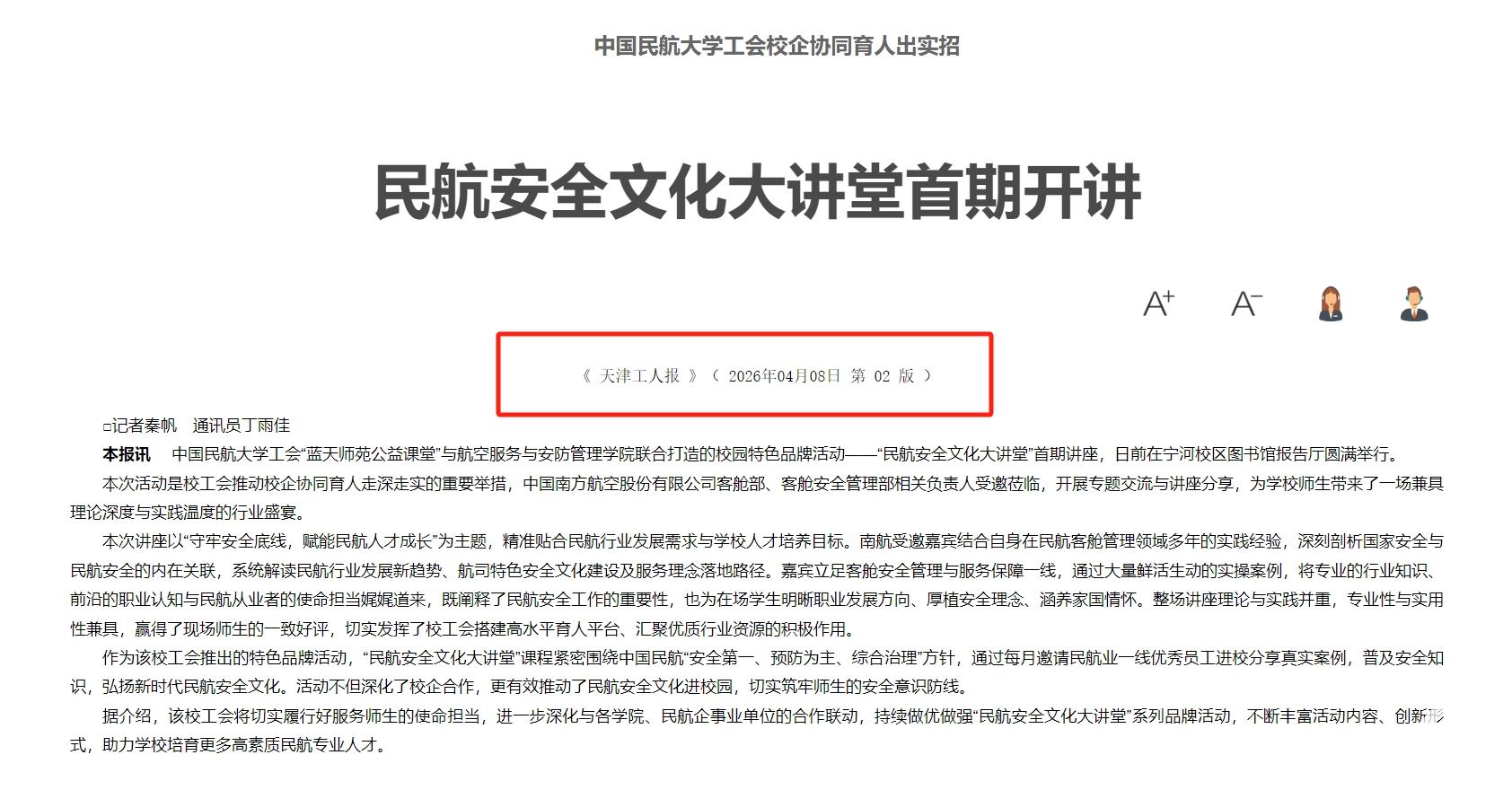作为该校工会推出的特色品牌活动,“民航安全文化大讲堂”课程紧密围绕中国民航“安全第一、预防为主、综合治理”方针,通过每月邀请民航业一线优秀员工进校分享真实案例,普及安全知识,弘扬新时代民航安全文化。活动不但深化了校企合作,更有效推动了民航安全文化进校园,切实筑牢师生的安全意识防线。