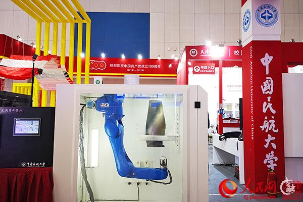 “飞机发动机叶片清洗润滑机器人”由该校牛国臣具体负责。该展品与国航合作研发,通过精密检测和智能控制,实现飞机发动机叶片复杂曲面的清洗和润滑操作,并保证高品质的清洗质量和高精度的润滑涂层厚度,从而降低机务人员的劳动强度、保障其身心健康、提高维修质量。该产品有望成为未来机务维修的必要设备,具有良好的应用前景。