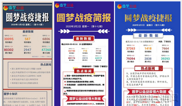 南京圆梦志愿者服务中心,简称“圆梦公益”,成立于2012年9月,是由国家民政部门和共青团系统登记注册成立的公益慈善类社会组织,原南京广播电视集团(南京网络电视台)等单位发起的“中国公益志愿者联盟(联盟公益)”,专注于志愿服务、公益创新创业、弱势群体关怀与发展、社会服务四大领域。网上防疫宣传志愿服务活动是圆梦公益在疫情期间开设的志愿者服务活动之一。陈思所在的网络宣传小组有共42名成员,分别来自全国各地40余所高校,“我们的主要任务就是借助网络媒体平台,如微博、微信等,传播此次疫情中正能量的人或事,分享每天的战‘疫’简报,抵制反对不良言论。战‘疫’团队陆续创作抗疫海报、战‘疫’视频,通过这样的方式传播防疫抗疫知识,传递社会正能量。”陈思介绍说。截至目前,陈思参与制作了18期简报,每期简报分享传播次数在4000次上下。